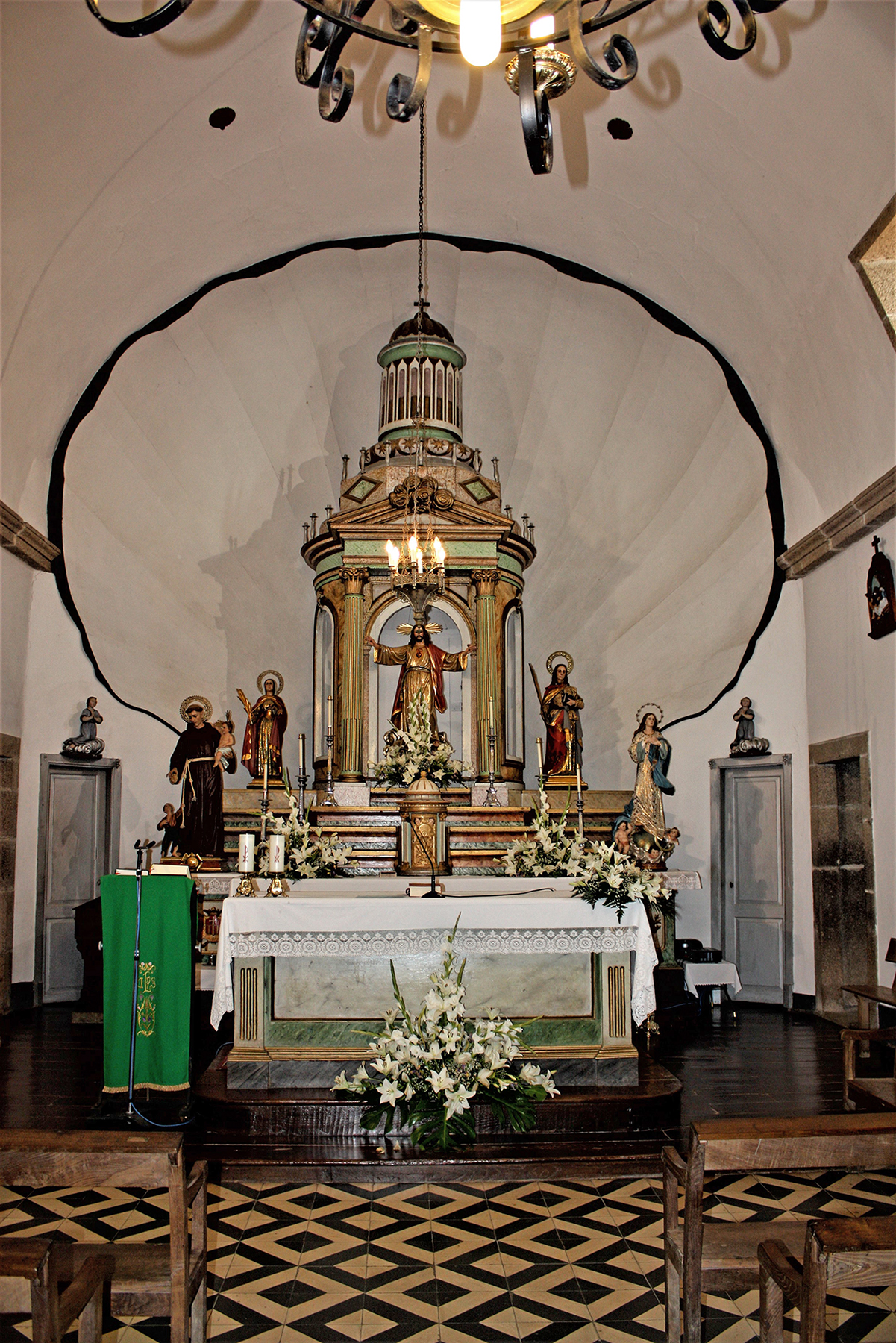 En el centro del retablo se ubica el sagrario, a su izquierda se encuentra la imagen de san Antonio y a su derecha, la de la Inmaculada Concepción. Ante el frontón del expositor se encuentra la imagen del Sagrado Corazón y a ambos lados se colocaron las imágenes de santa Lucía, a la izquierda y de santa Olalla, patrona de la parroquia, a la derecha; la imagen de santa Lucía procede de una antigua capilla que existió en el antiguo lugar de Dúas Casas, hoy da Rúa, sito en la misma feligresía de Santaia de Arca. Todo el conjunto del retablo se acoge a la concavidad de una enorme venera de madera que se levanta detrás, ocultando por completo el muro testero de la capilla. La venera fue realizada en el taller local do Muíño da Pena y hoy está pintada de blanco con el reborde marcado en negro.