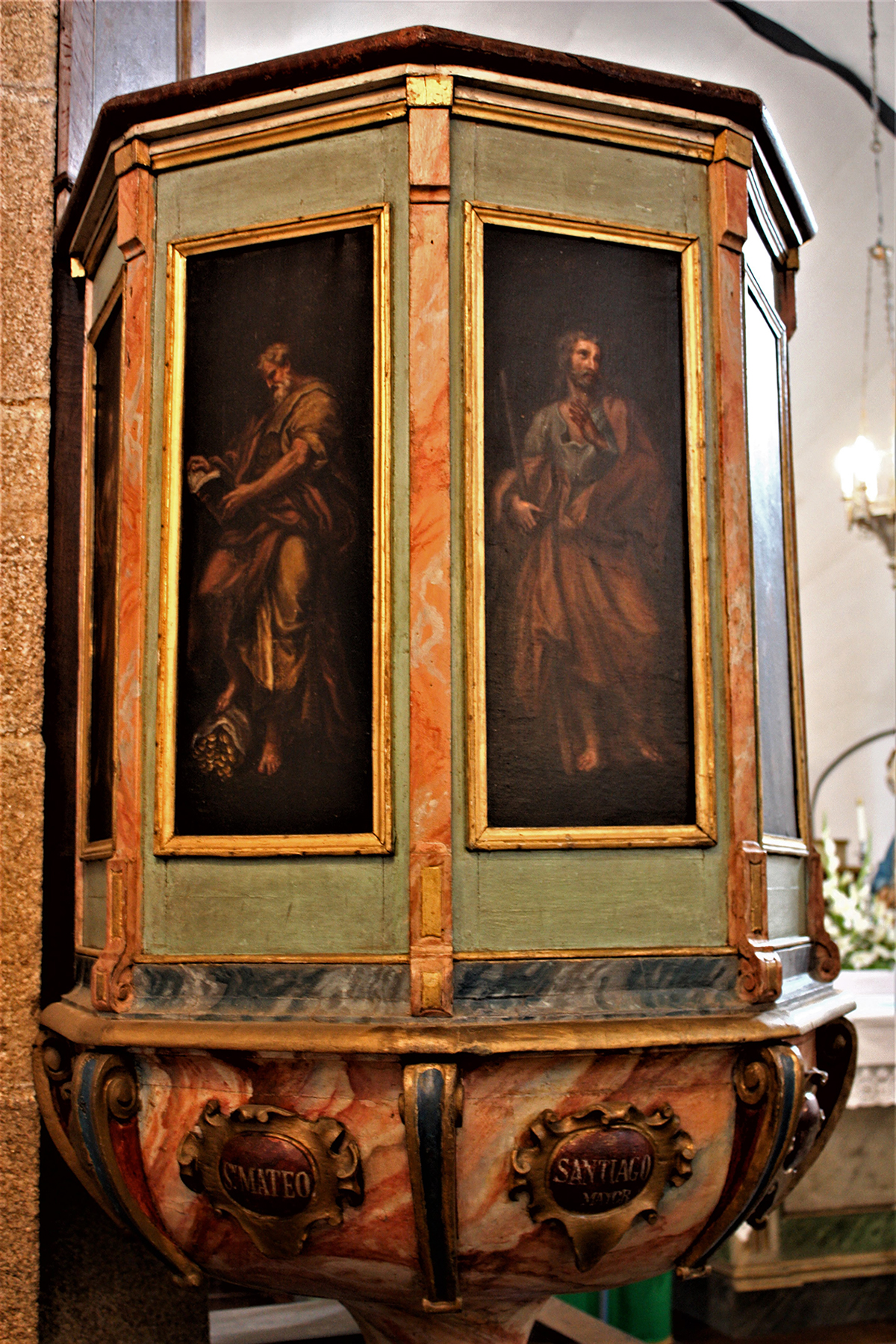 Detalle del púlpito con las pinturas de san Mateo y Santiago. |