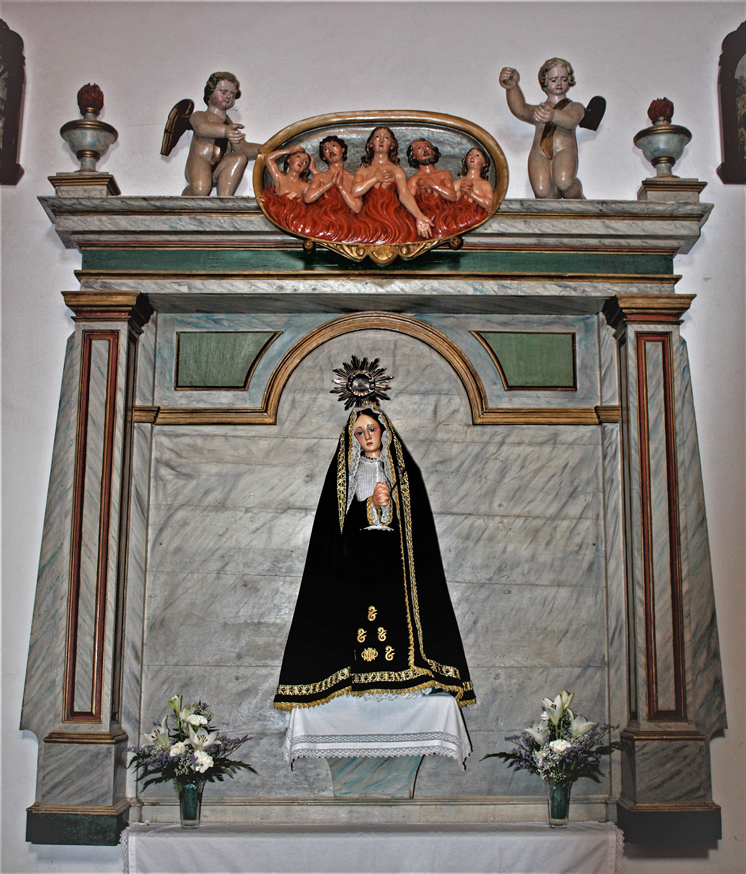 Arrimado al muro norte de la nave, se encuentra un sencillo retablo que acoge una imagen de vestir de la Dolorosa. Este, de sencilla factura concentra toda la atención en el lienzo sobre el que se sitúa la imagen de la virgen, compartiendo protagonismo con el relieve de las ánimas del purgatorio acompañado de ángeles.
