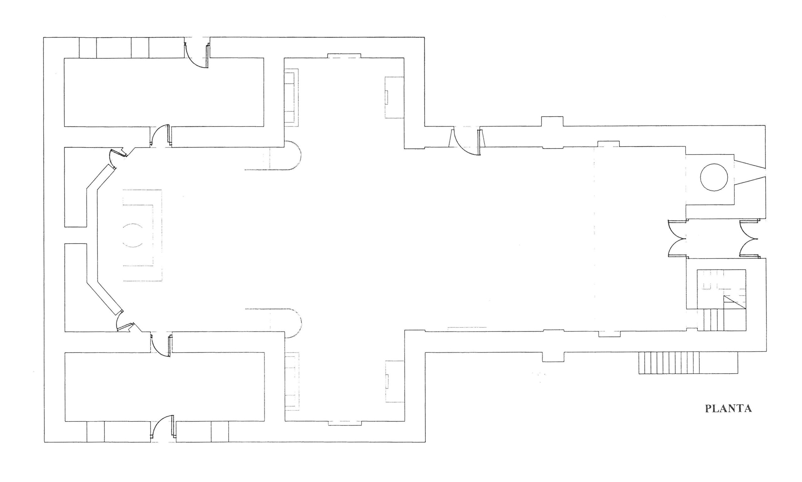 Planta de la iglesia. (José Antonio Franco Taboada, Santiago Tarrío Carrodeguas (dirs.), A arquitectura do Camiño de Santiago: descrición gráfica do Camiño Francés en Galicia, Santiago [de Compostela], Xunta de Galicia, A Coruña, Universidade da Coruña, D.L. 2000). |