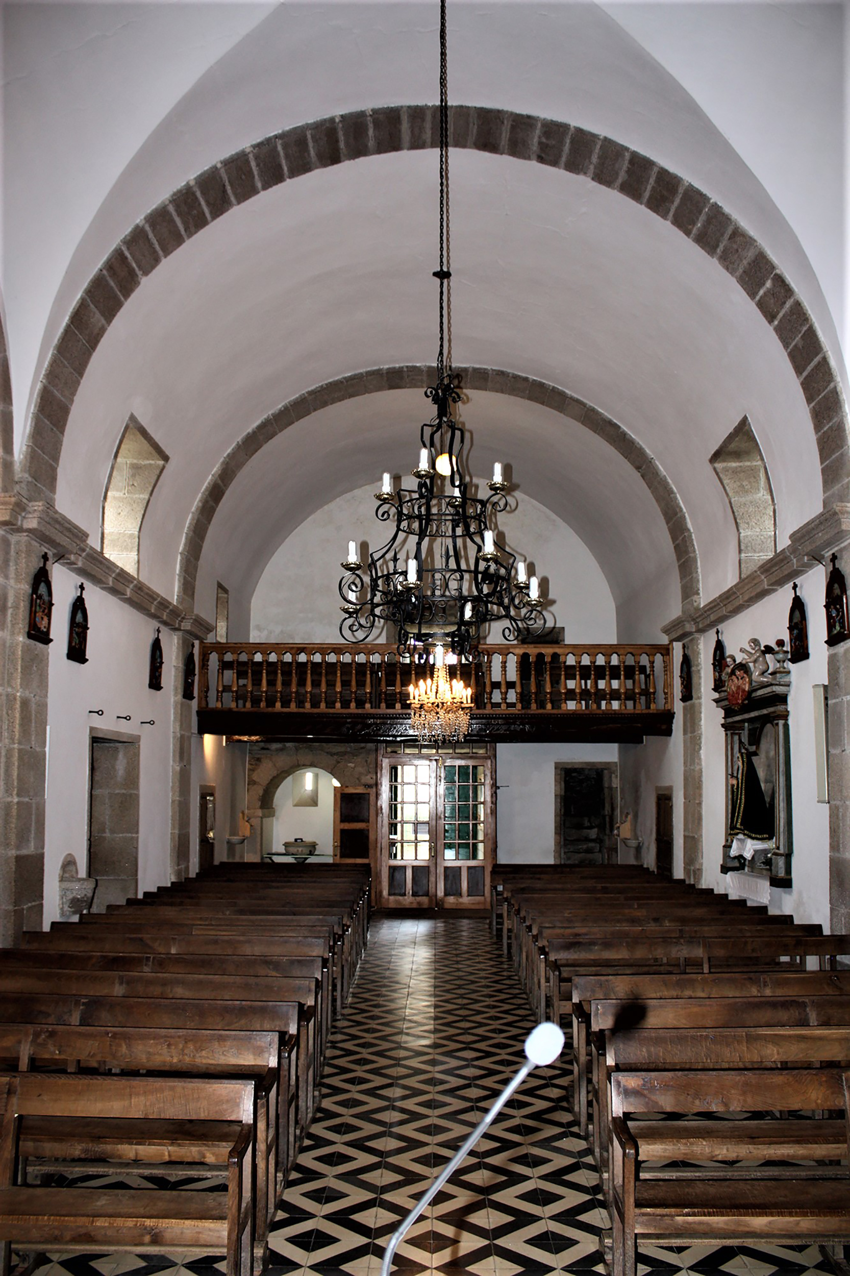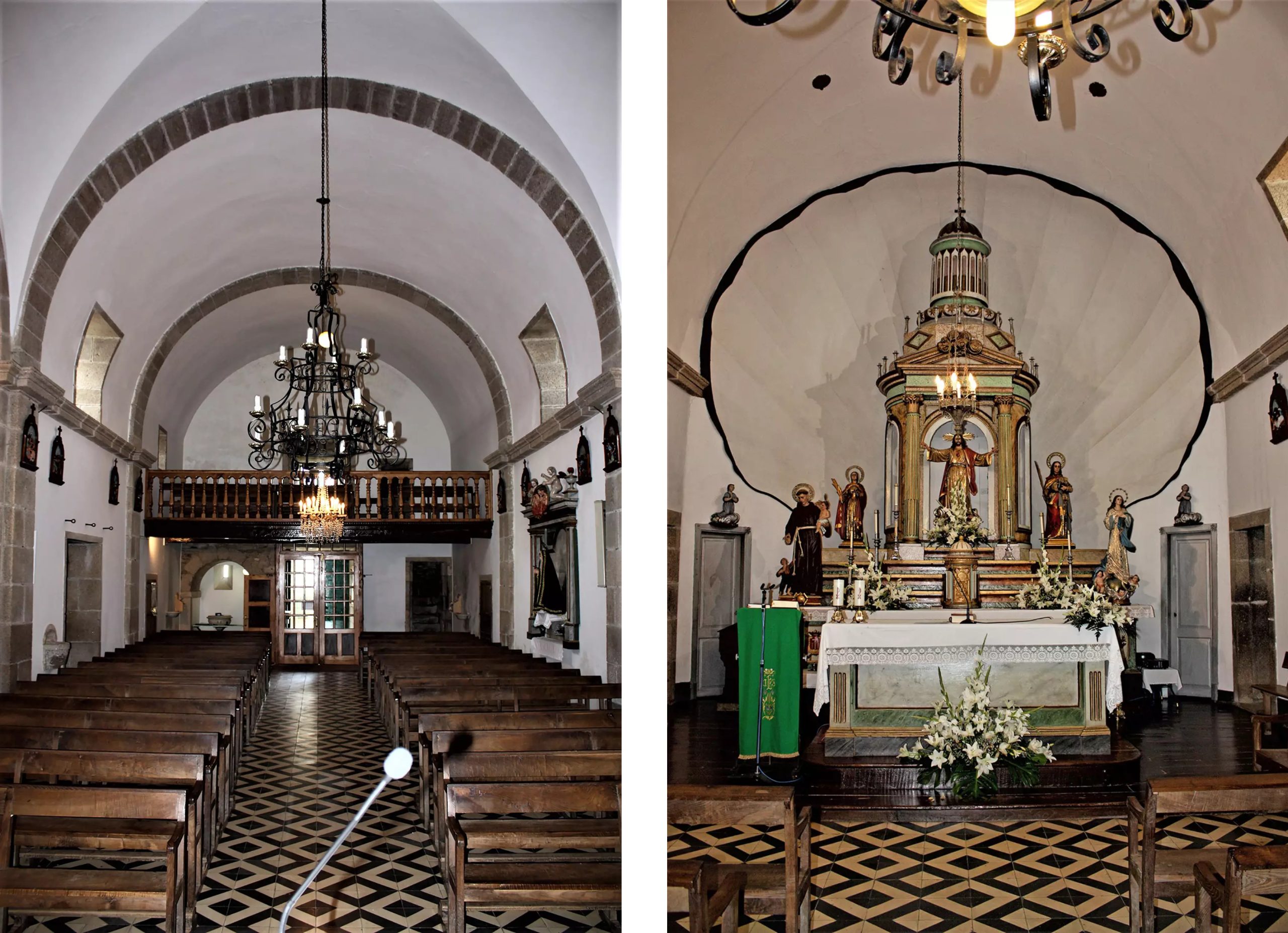 | Interior de la iglesia: pies de la nave (izquierda) y vista de la cabecera (derecha). |
