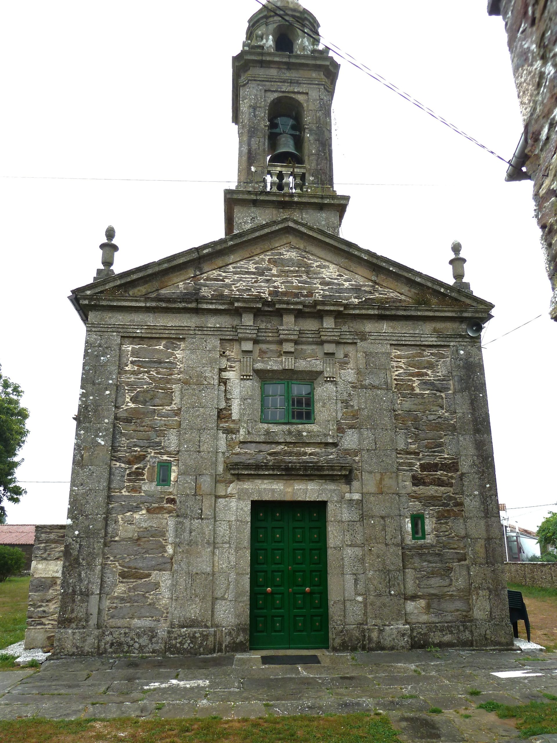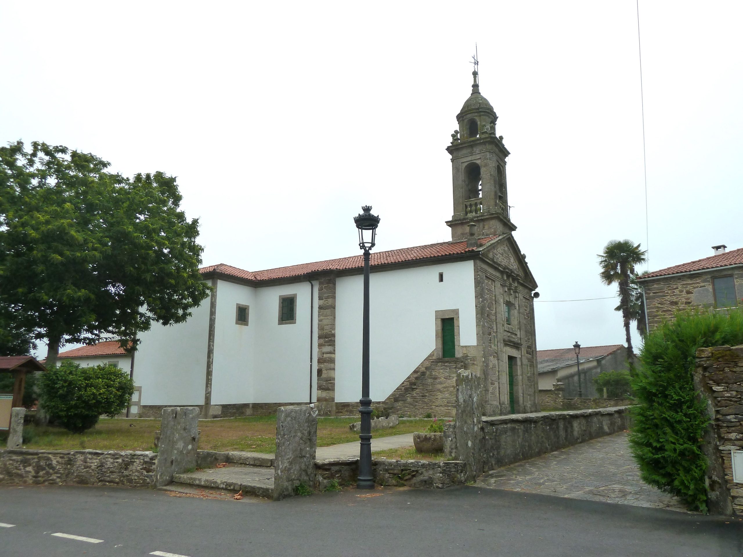 El campanario, de estilo barroco compostelano, cuenta con un basamento sobre el que se apoya un primer cuerpo de planta cuadrangular y esquinas achaflanadas horadado en cada una de sus caras por arcos de medio punto que permiten el volteo de las campanas. Sobre este primer cuerpo discurre una cornisa corrida adornada con cuatro pares de pináculos colocados en las esquinas. Sobre la cornisa se alza el segundo cuerpo del campanario que consta de un templete circular en el que se abren otros cuatro pequeños arcos flanqueados por pilastras de igual proporción. El templete presenta una cornisa moldurada sobre la que se apoya una pequeña cúpula coronada por un pináculo con veleta y cruz de hierro.
