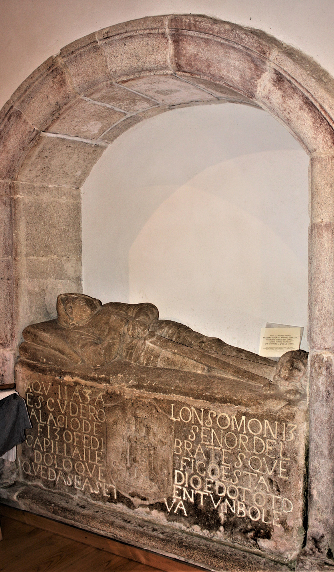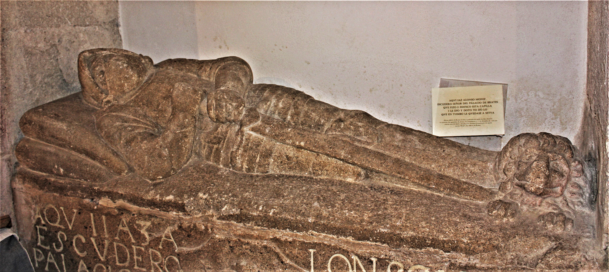 “Aquí yaz Alonso Moniz escudero, señor del palacio de Brates que fizo e edificó esta capilla y le dio e doto todo lo que en tumbo le quedase [a serva?]”.