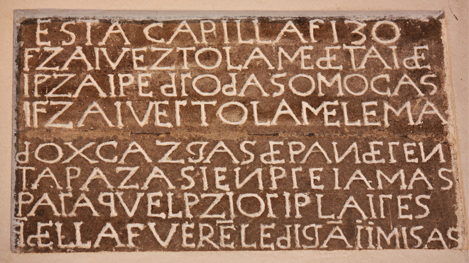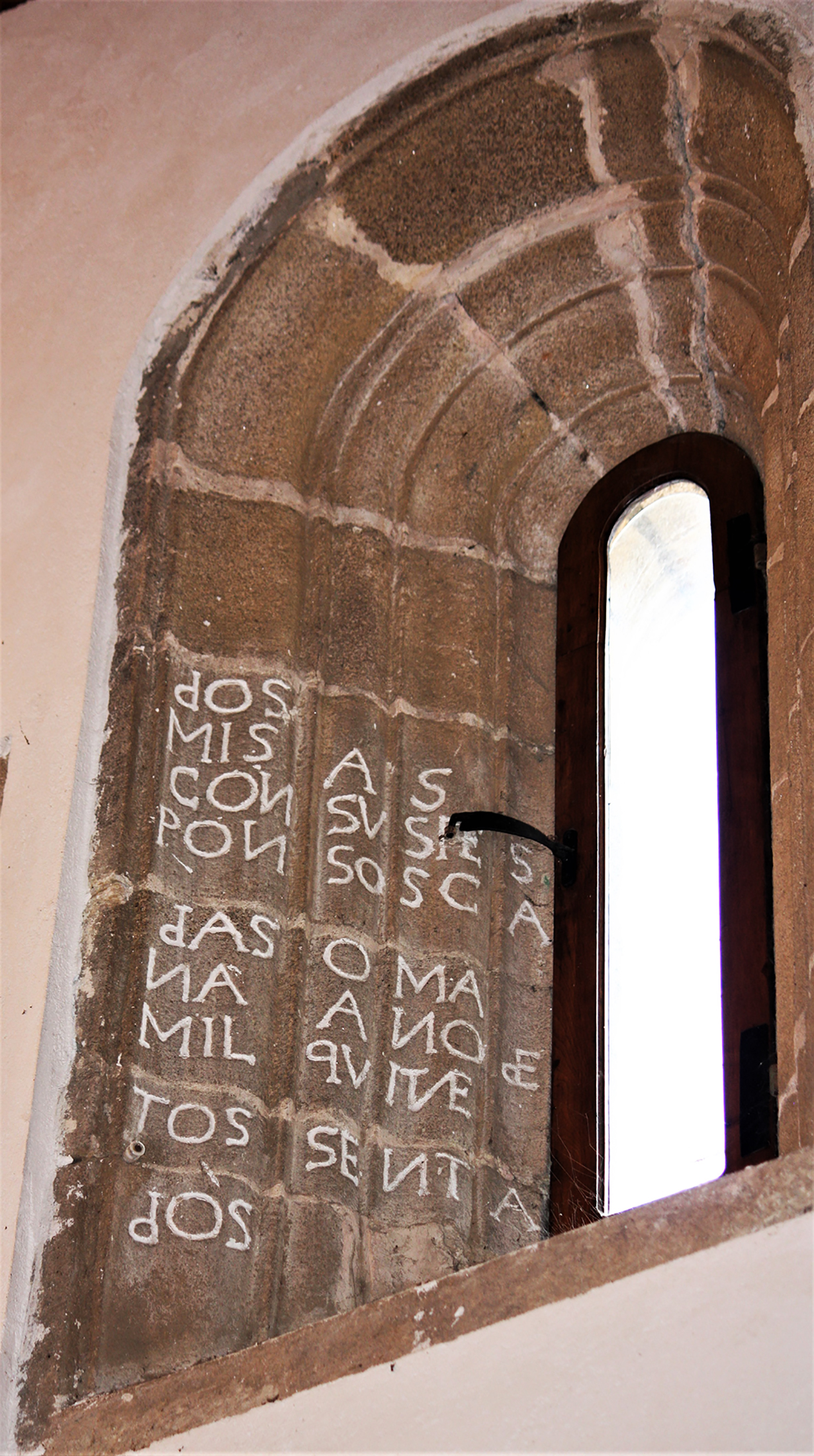 A la izquierda de esa misma ventana, sobre dos sillares de granito que conforman el paramento del muro, hay otra inscripción que dice: