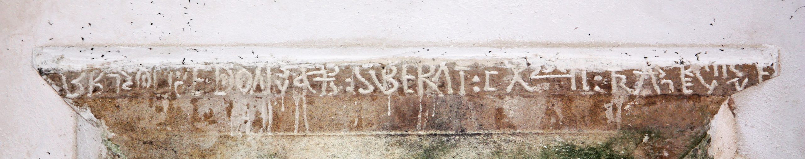 En el dintel de la ventana que está sobre la puerta principal, que es una pieza reaprovechada, se encuentra un epígrafe (hasta ahora inédito) escrito en latín en el que se pueden ver algunas letras y abreviaturas, cuya lectura podría ser: […]EDONvsaPs:SUBERAI:cXLªII:[…]. Parece clara la fecha: “sub era milésima centésima cuadragésima segunda”, (era 1142; año de 1104); sin embargo, las abreviaturas que se le anteponen admiten diversas interpretaciones, entre ellas cabría: […]E DO[mi]Nvs a[rias]P[ere]s: […].
