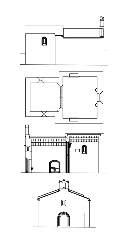 Planta, alzados y sección del interior de la capilla. (José Antonio Franco Taboada, Santiago Tarrío Carrodeguas (dirs.), A arquitectura do Camiño de Santiago: descrición gráfica do Camiño Francés en Galicia, Santiago [de Compostela], Xunta de Galicia, A Coruña, Universidade da Coruña, D.L. 2000). |