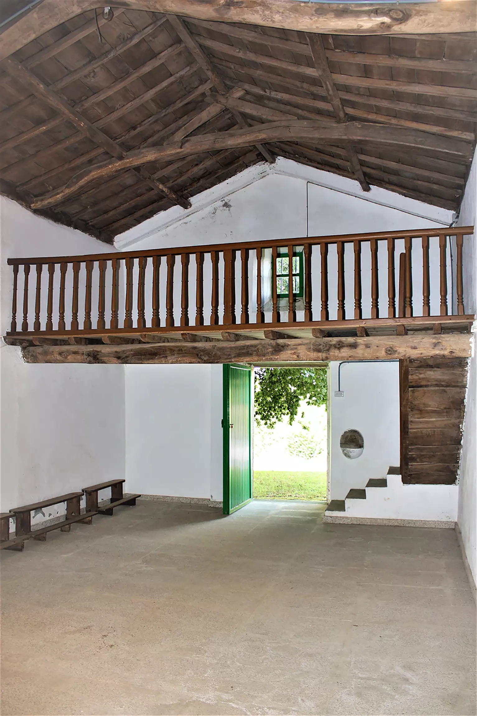 En el interior, la capilla cuenta con un coro alto de madera al que se accede mediante una escalera con un primer tramo de obra al que sigue otro de madera. La techumbre sigue la estructura exterior vista con vigas tirantes de madera. De su interior cabe destacar el retablo mayor, procedente de la capilla de San Lázaro da Casa Grande das Barrosas, en Santiago de Arzúa.