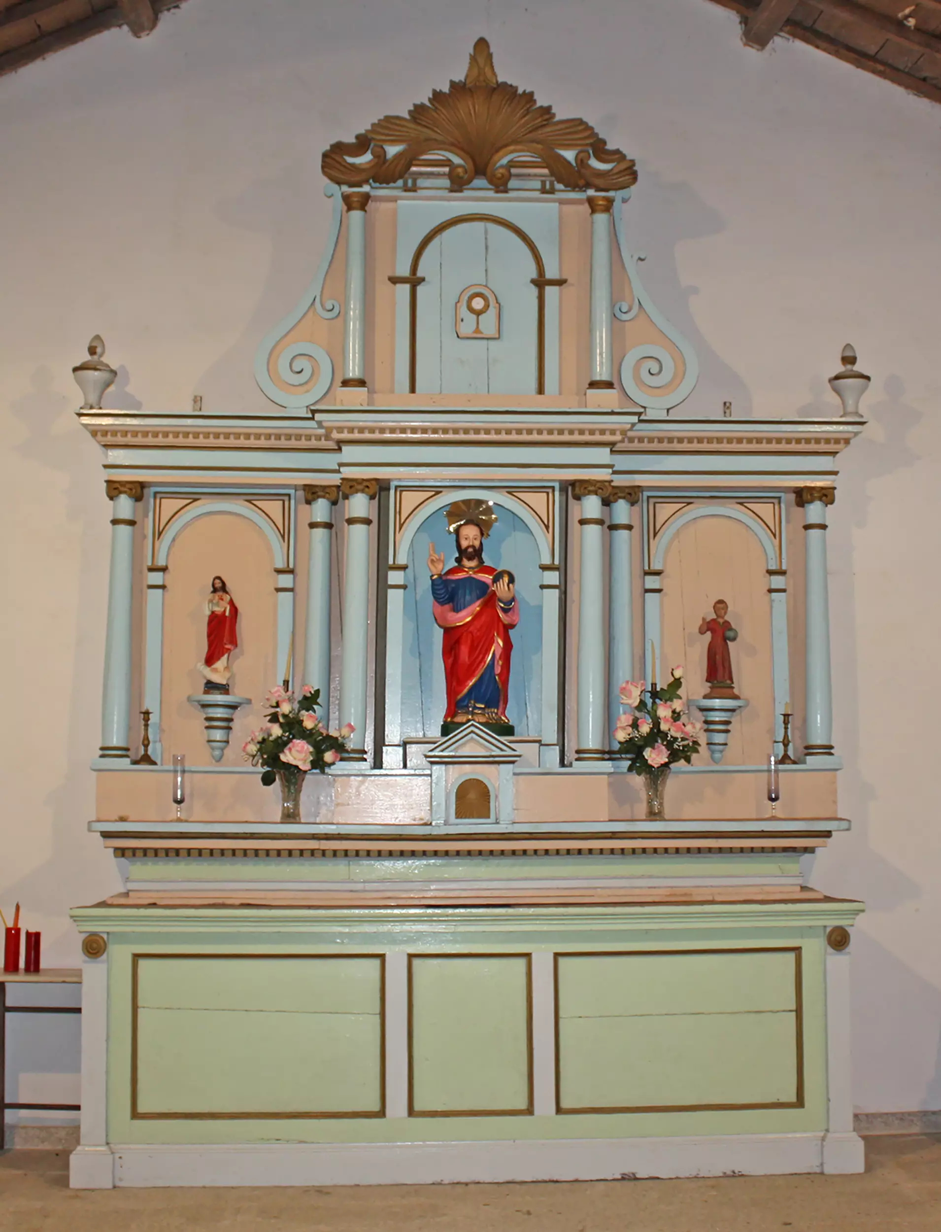 El retablo tiene la mesa de altar adosada y se organiza en un primer cuerpo con tres calles y un ático enlazado mediante alerones con cuerpo inferior. De un humilde estilo neoclasicista, en el primer cuerpo tiene imágenes del Salvador (en el centro), el Niño Jesús de Praga (a la derecha) y el Sagrado Corazón (a la izquierda). Bajo el Salvador está el sagrario, y en el ático hay lo que parece una puertecita con un relieve que podría funcionar como expositor del Santísimo Sacramento. La imagen del Salvador fue restaurada y repintada recientemente, y la corona es un añadido.