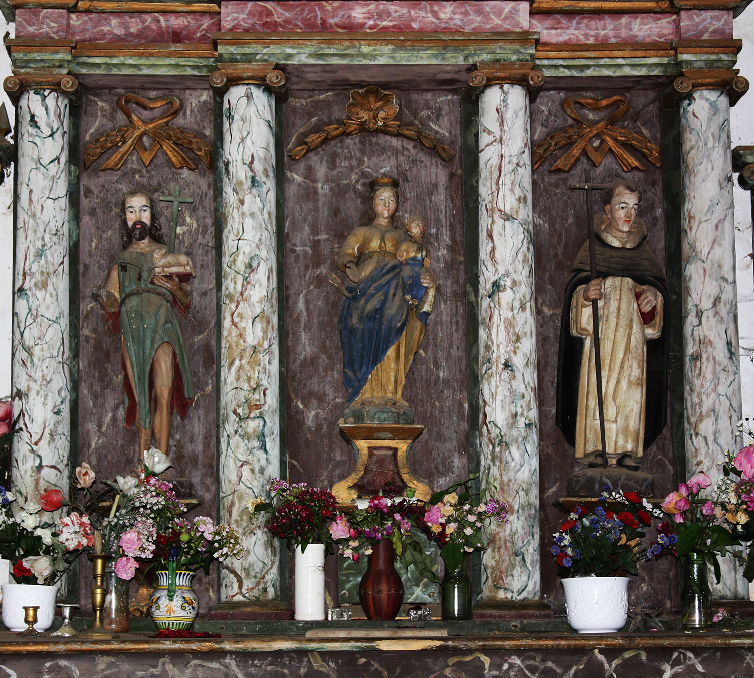 A los lados del retablo, en dos hornacinas independientes, se colocaron las imágenes de san Antonio y de un santo obispo en actitud de bendecir con la mano derecha y con un libro abierto en la mano izquierda, que podría ser san Nicolás.