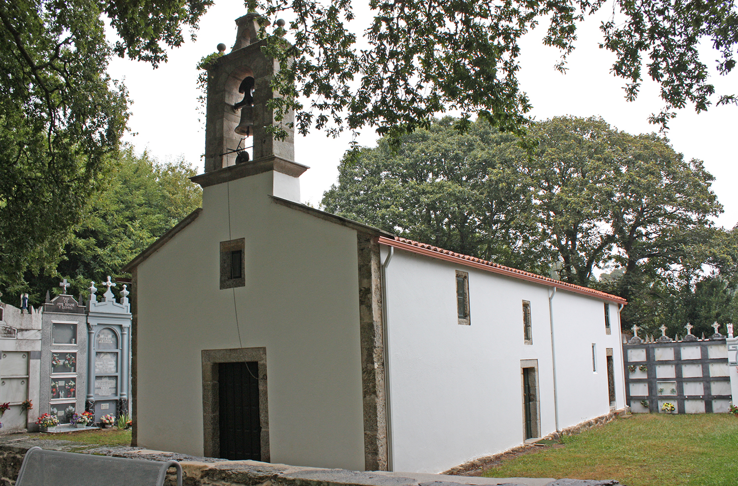 La fachada principal está orientada al oeste, tiene una sencilla portada adintelada sobre la que se abre una pequeña ventana rectangular. A su vez, sobre la ventana y en el vértice del tejado, se eleva la espadaña que es toda de cantería de granito y se apoya sobre un plinto rectangular con cornisa lisa. La espadaña tiene un solo arco de medio punto que permite el volteo de la campana de bronce que aloja en su vano; encima se eleva un reducido frontón con otro pequeño arco de medio punto en el centro; el frontón se adorna con dos pináculos laterales y otro más colocado sobre el vértice superior, que aparece coronado por una cruz que, según consta en el Libro de Fábrica de la iglesia, es anterior al año 1850.