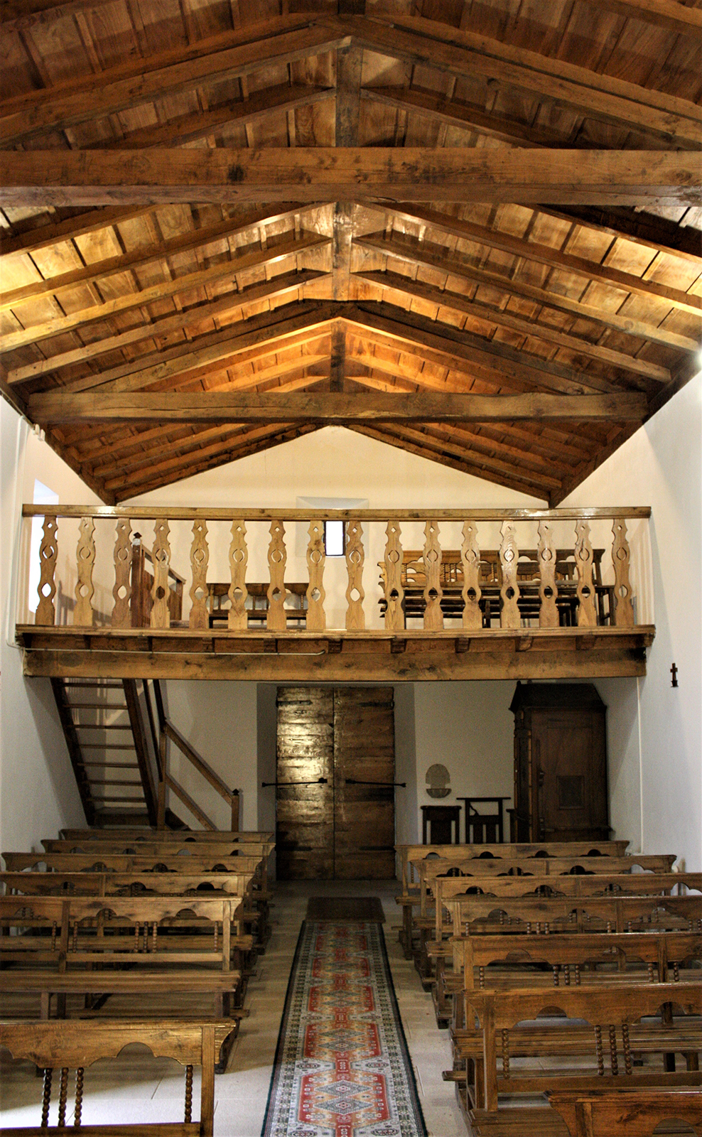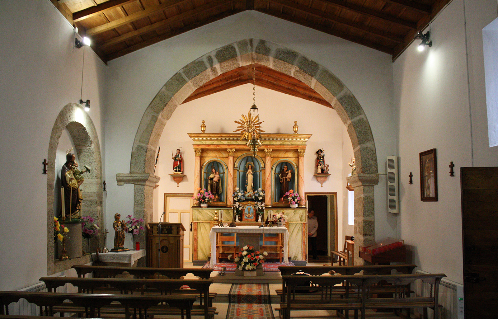 En el interior de la nave un arcosolio encastrado en el muro norte, acoge la imagen de san José con el Niño datada en el año 1904. Ante el arcosolio y arrimada contra el muro testero de la nave se encuentra sobre una base cilíndrica una antigua pila bautismal de forma tronco-piramidal, tallada en una pieza monolítica de granito, que se adorna con una sencilla moldura que la circunda. Hoy en día, la pila sirve de improvisada peana que sustenta la imagen de san Antonio; esta imagen, que probablemente procede de un taller local, presenta los ropajes del santo y del Niño estofados con pan de oro. A los pies de la nave se levanta una tribuna alta con balaustrada, todo ello hecho de madera, lo mismo que la escalera interior por la que se accede a ella.