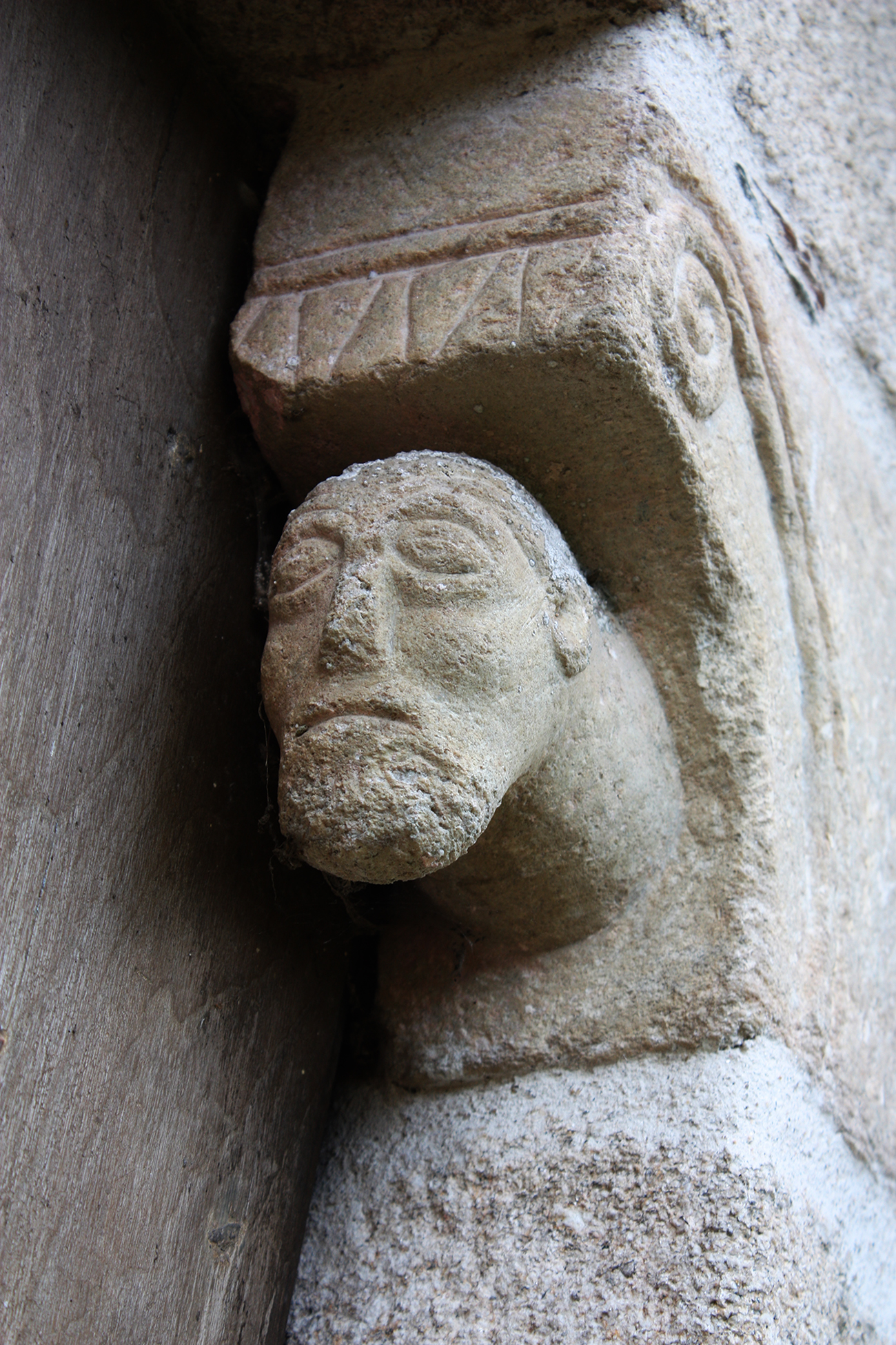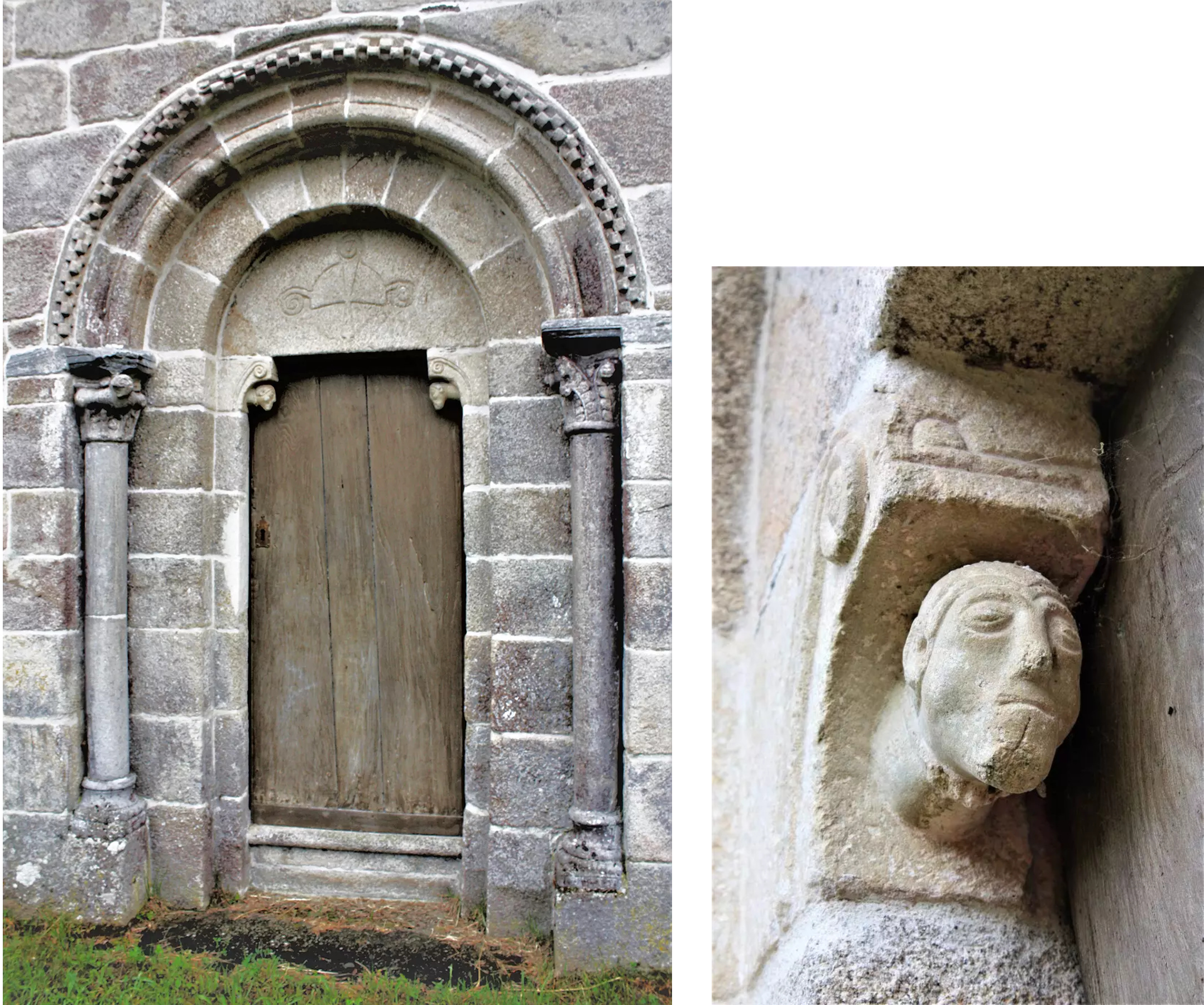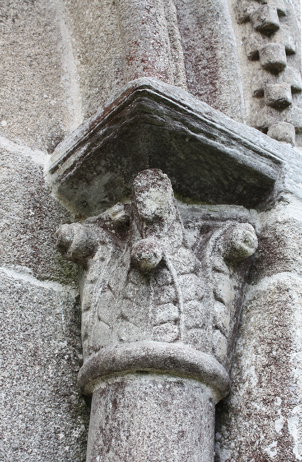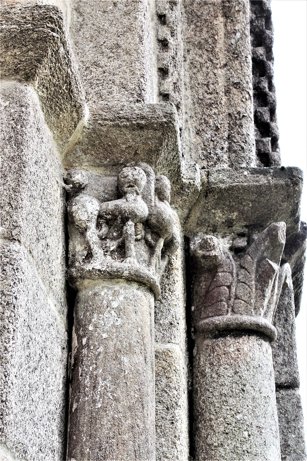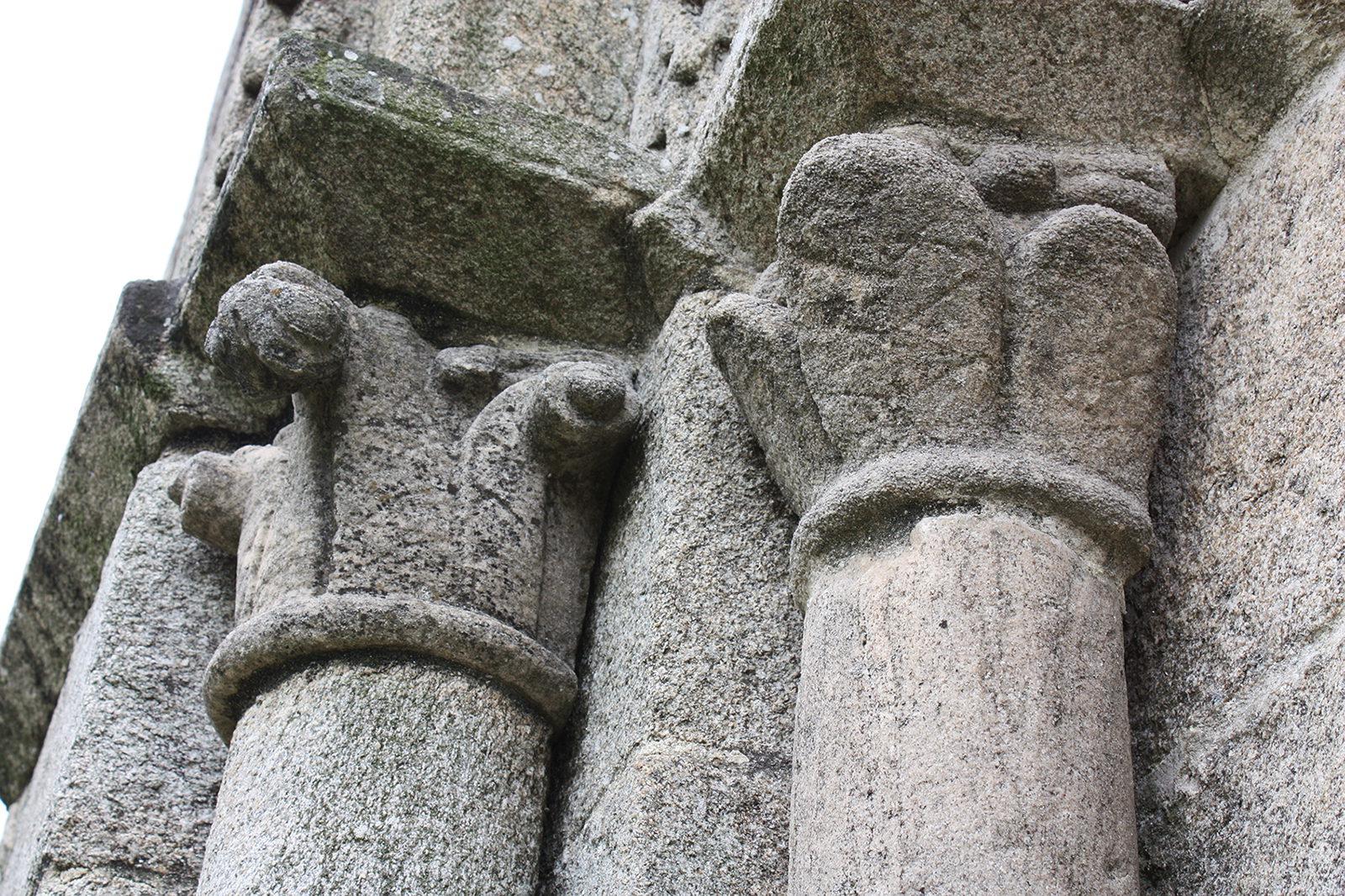Portada principal en la fachada principal (izquierda) y detalle de los capiteles en la misma portada (derecha).