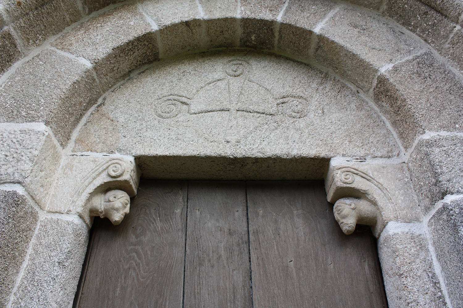 El edificio se construye con sillería de granito y la fachada principal sigue el esquema románico, en el que se dispone la portada de acceso en el mismo eje vertical que la espadaña. La primera, cobra forma a partir de un arco de medio punto con tímpano liso que apoya sobre ménsulas que sobresalen de las jambas. En la actualidad, las ménsulas se presentan prácticamente desprovistas de ornamentación; sin embargo, en su origen sí contaban con tallas, pudiendo únicamente señalar en la pieza de la izquierda cuatro patas de lo que pudo haber sido una figura zoomorfa.