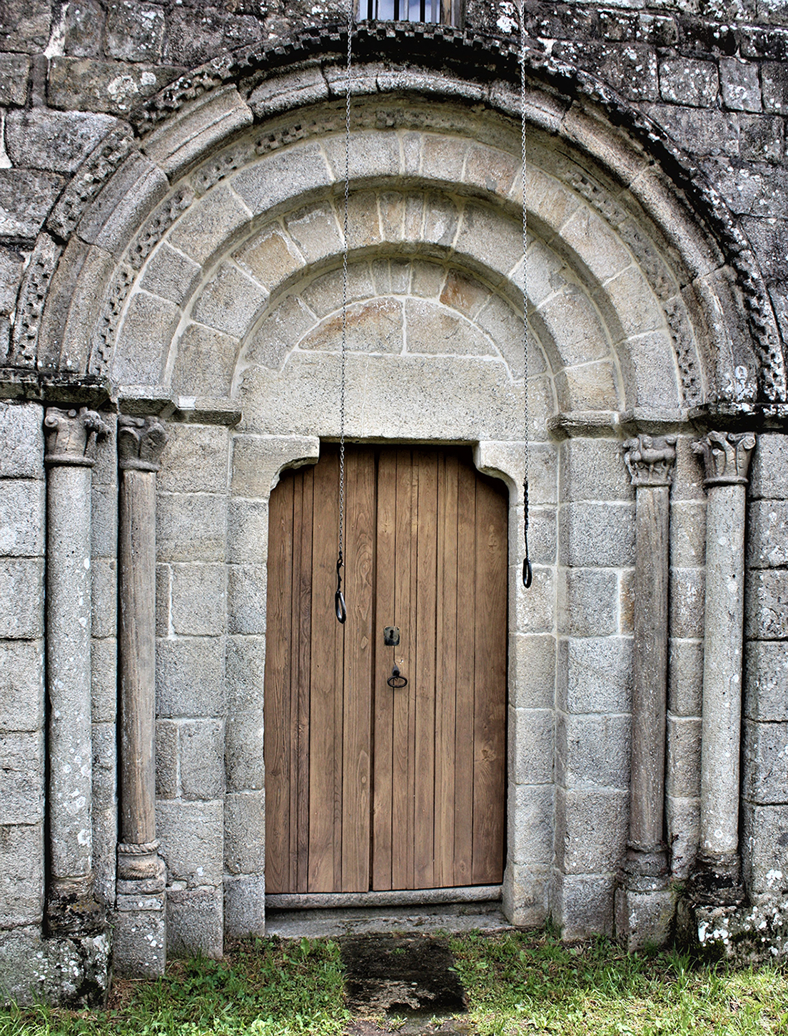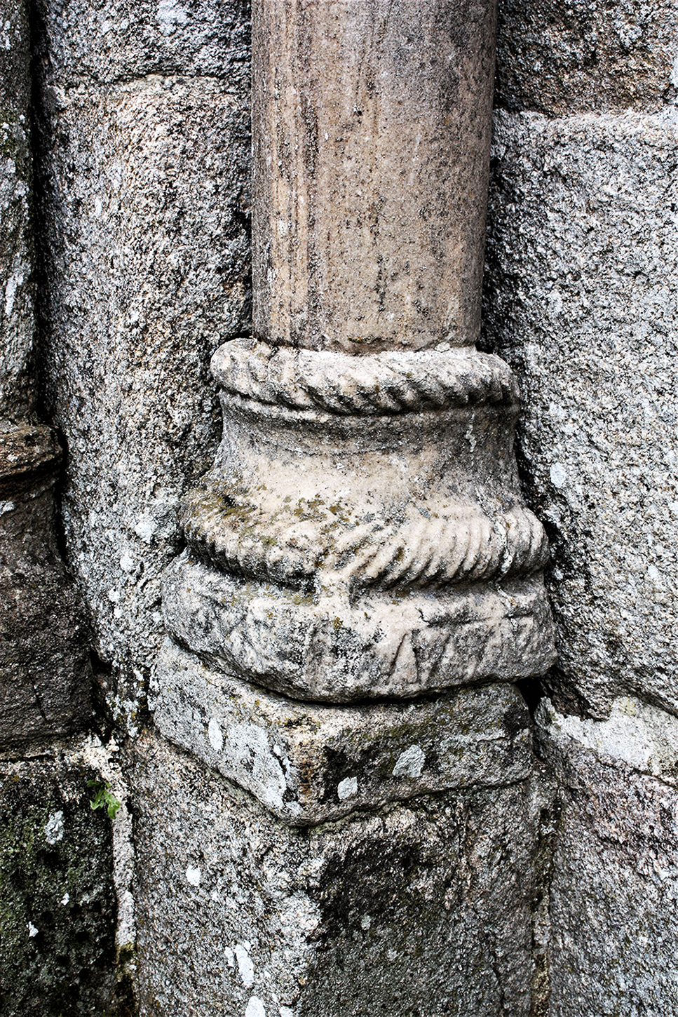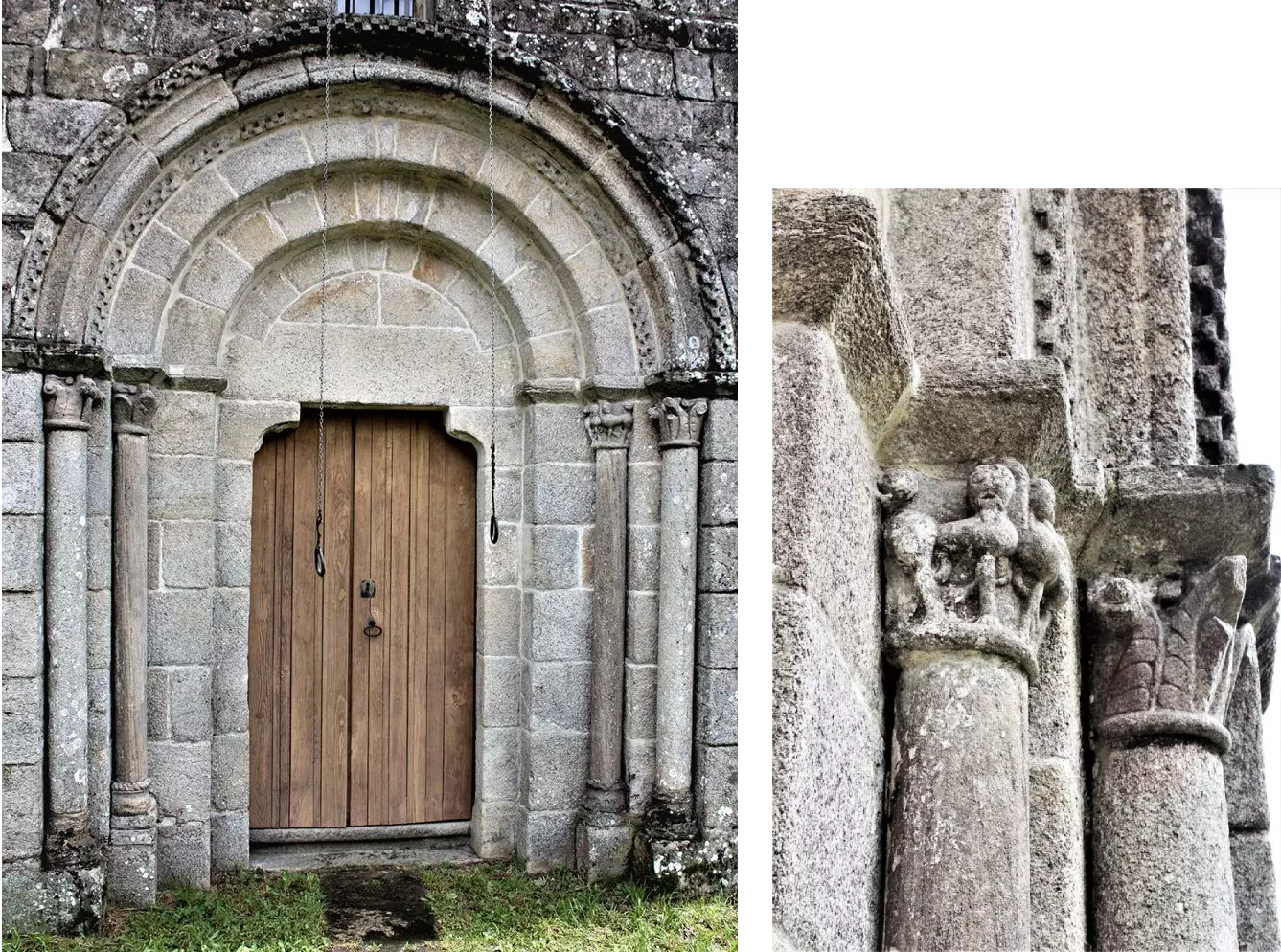 Este arco inicial está circundado por tres arquivoltas, también de arco de medio punto. Mientras la primera vuelta del arco descarga sobre la línea e imposta corrida y columnas de sección rectangular, las externas lo hacen sobre capiteles corintios, fuste liso de sección circular, basa ática y alto plinto. La basa de la columna interior derecha presenta en el anillo ornamentación de soga con incisos en zigzag y es de mármol, a diferencia de las que la acompañan en la portada, material quizá procedente de las canteras de O Incio, población del sureste de la provincia de Lugo.