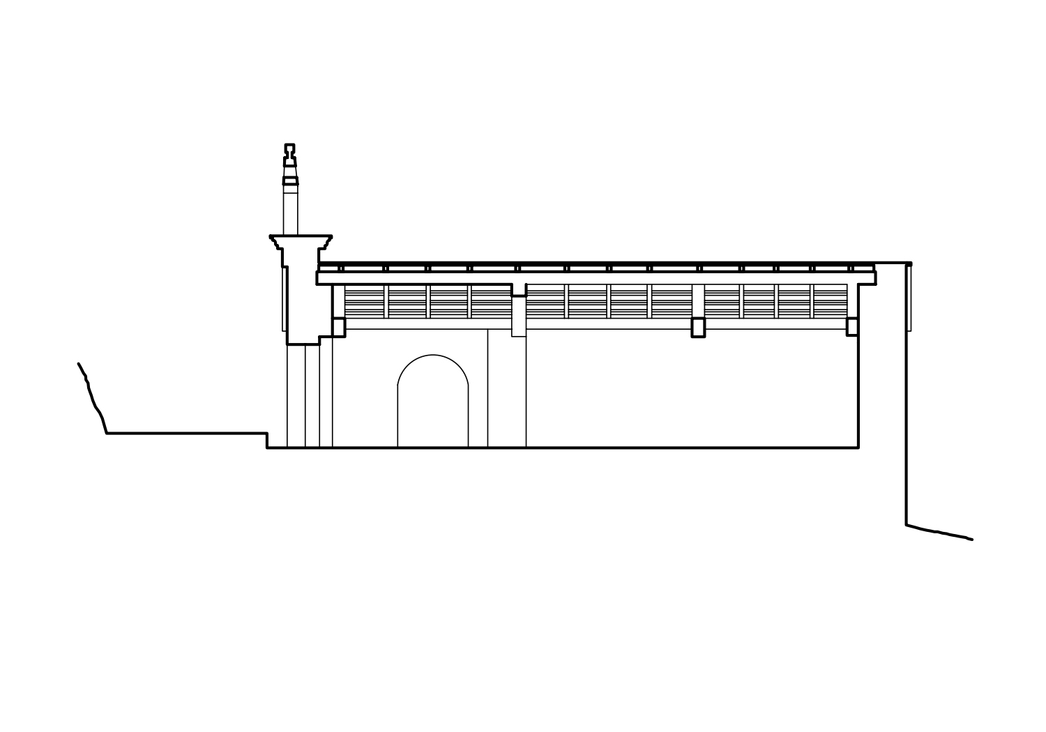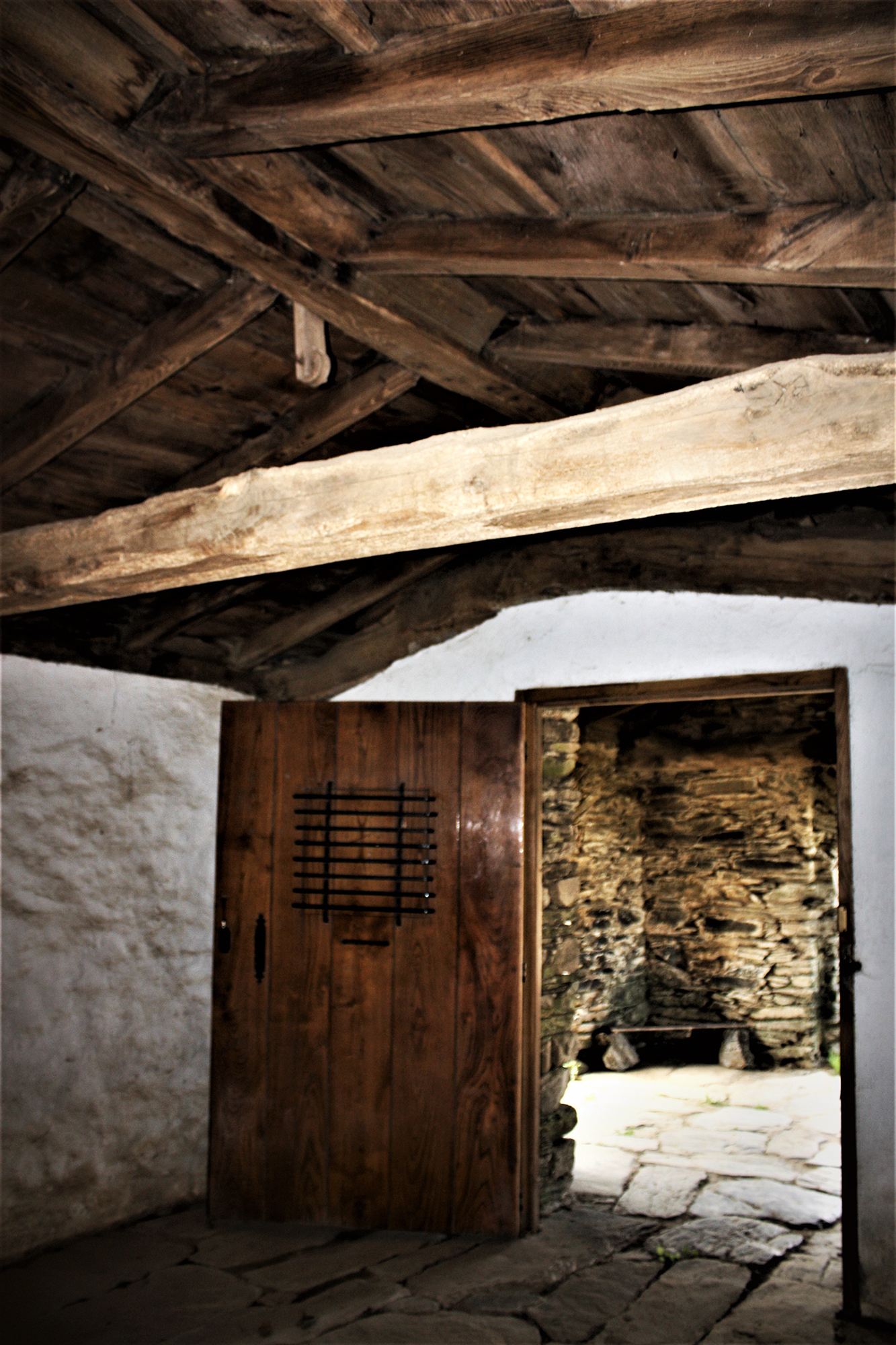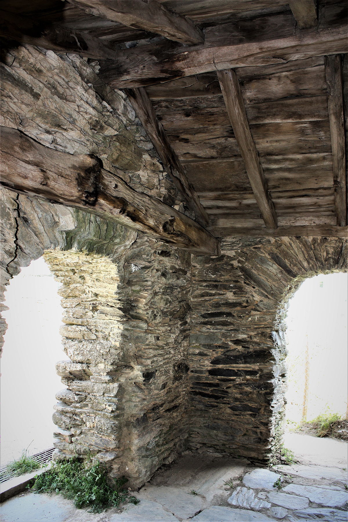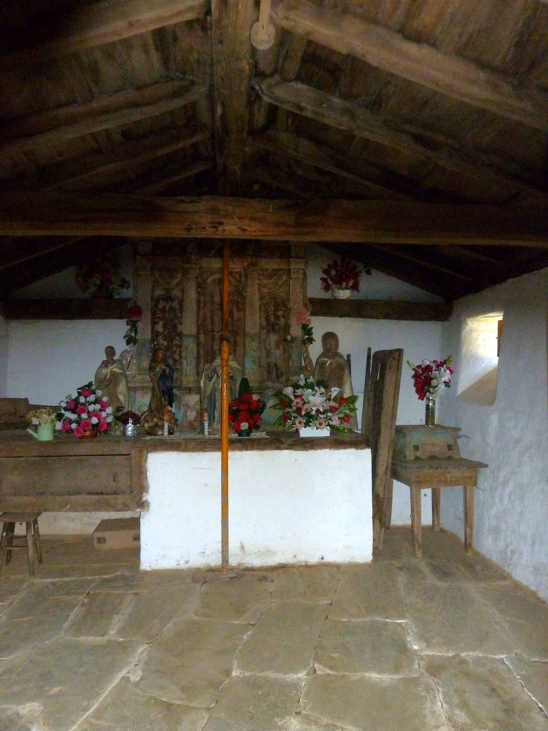 Esta simplicidad en los elementos de la cara principal se prolonga en los muros laterales que cuentan con una única ventana abocinada en el último tramo del muro sur. El edificio se techa con cubierta a dos aguas de pizarra en el exterior y, en el interior, se mantiene el entramado de madera y vigas con idéntica estructura.