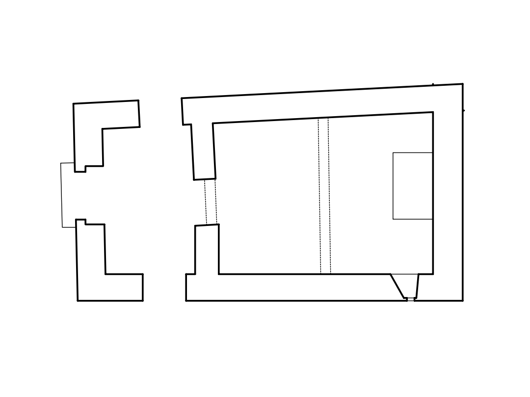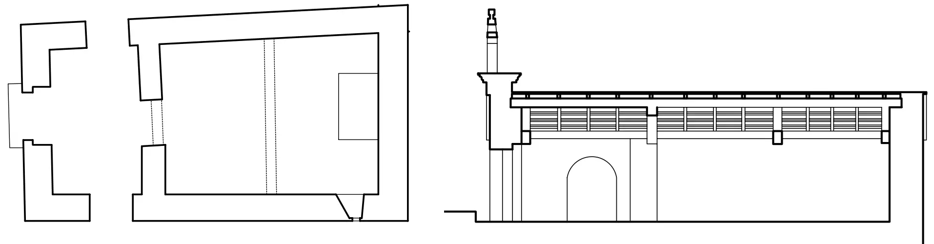 Planta (izquierda) y sección longitudinal de la ermita (derecha)..(José Antonio Franco Taboada, Santiago Tarrío Carrodeguas (dirs.), A arquitectura do Camiño de Santiago: descrición gráfica do Camiño Francés en Galicia, Santiago [de Compostela], Xunta de Galicia, A Coruña, Universidade da Coruña, D.L. 2000).