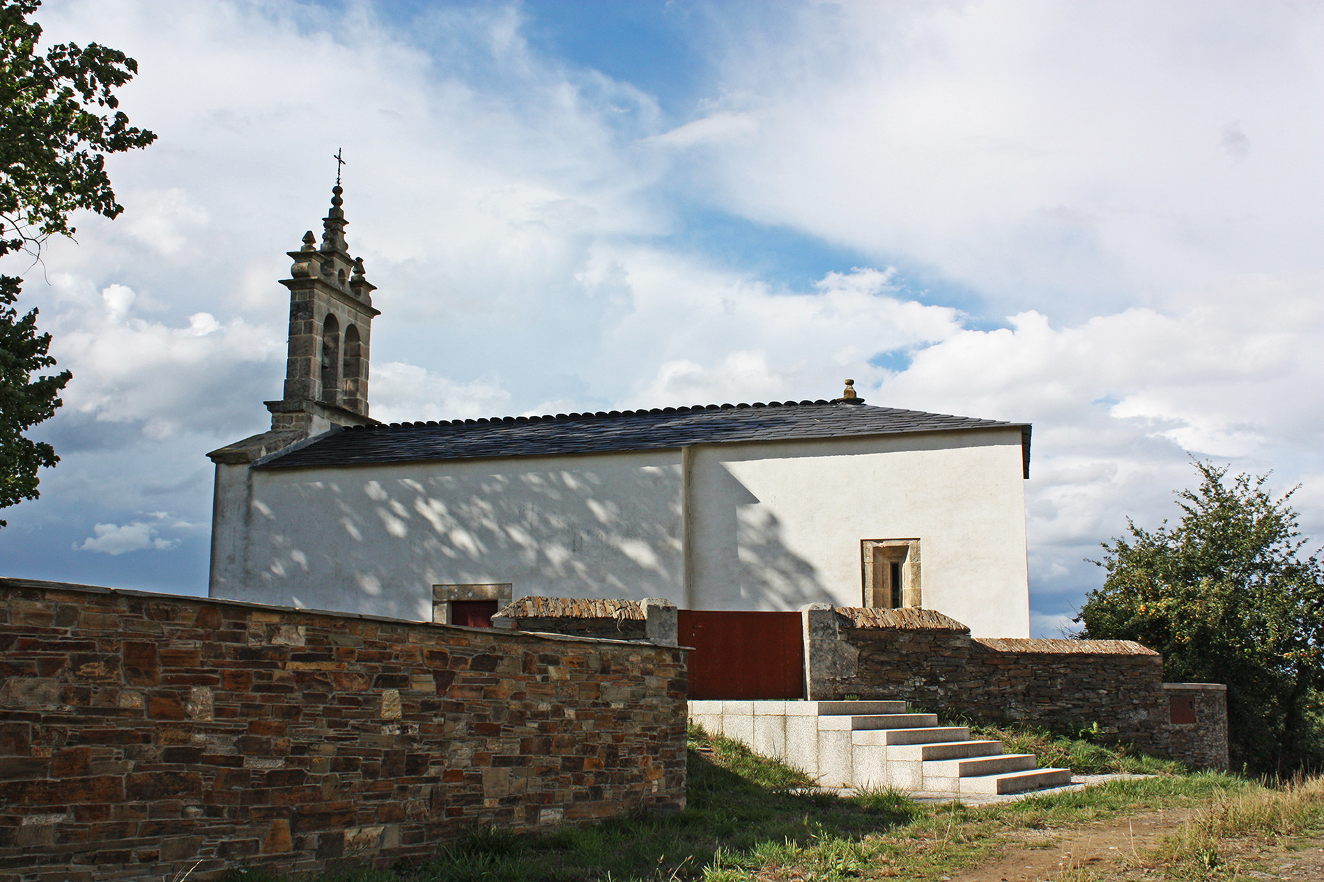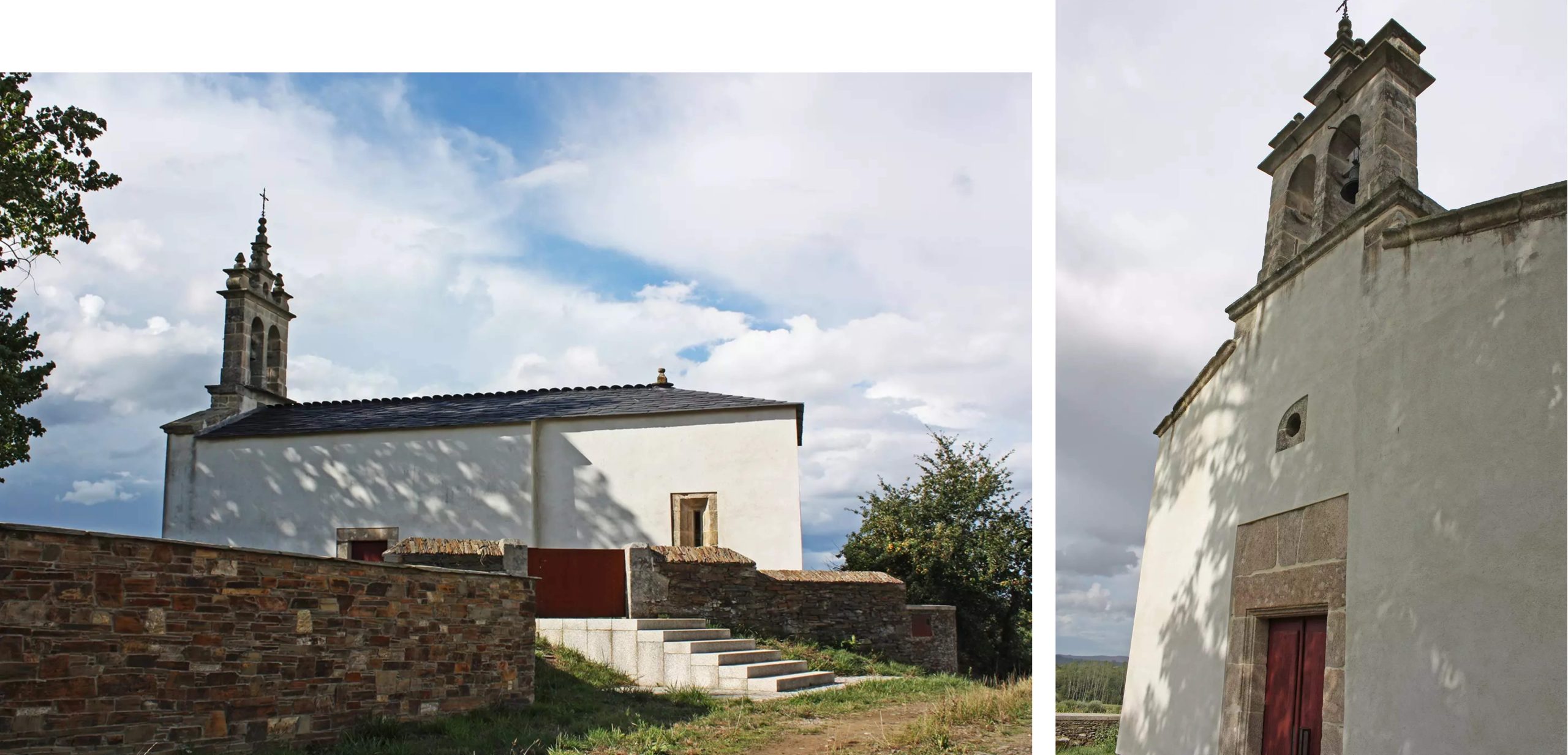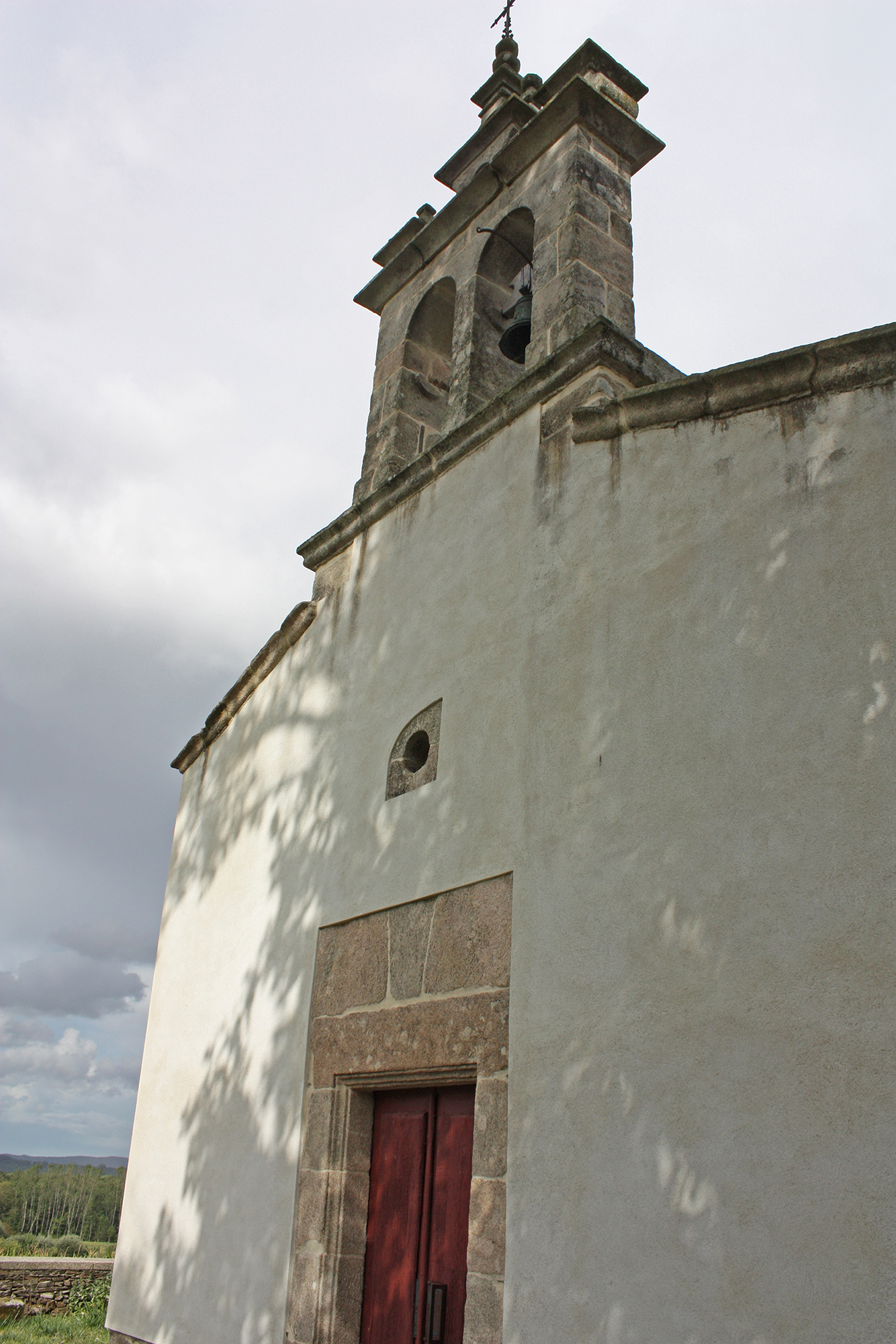 El templo es de una una sola nave rectangular con ábside cuadrado de planta menor. Los muros laterales y las fachadas anterior y posterior están recebados y pintados. Es posible registrar una pila bautismal anexada a la fachada y en el muro sur cuenta con un acceso secundario adintelado, remarcado por sillares de granito. Esta fórmula se repite en la fachada de acceso, aunque con un dintel rectangular de granito sobre la portada. Determinando el eje vertical, le sigue un óculo en el registro superior y una esbelta espadaña que se eleva sobre la línea de cubierta en un cuerpo de doble vano con arco de medio punto sobre el que se sitúa un pequeño entablamento con pináculos en los extremos y un pequeño frontón horadado sobre el que reposa un trío de pináculos. El edificio se cubre con pizarra siguiendo la forma a tres aguas.