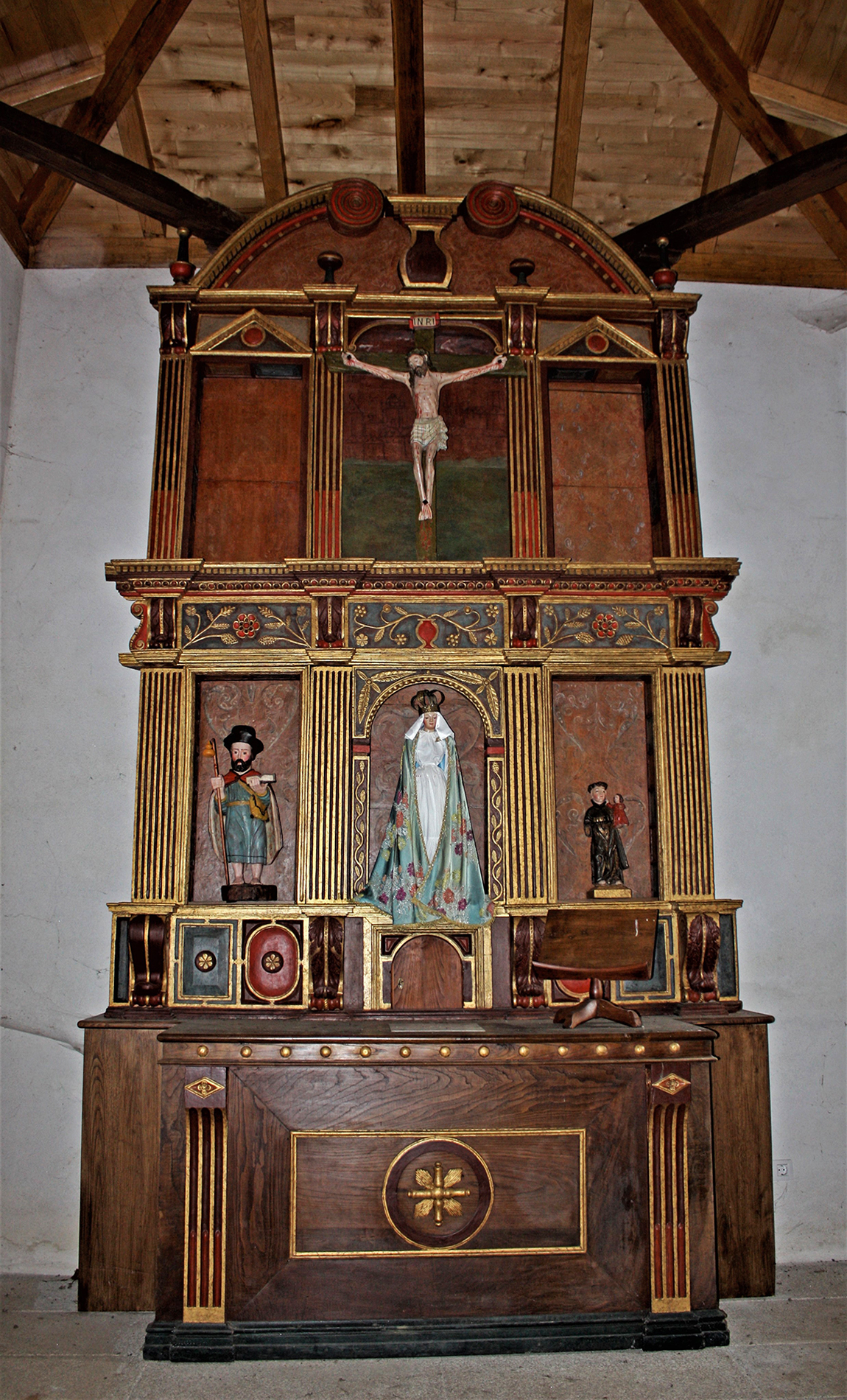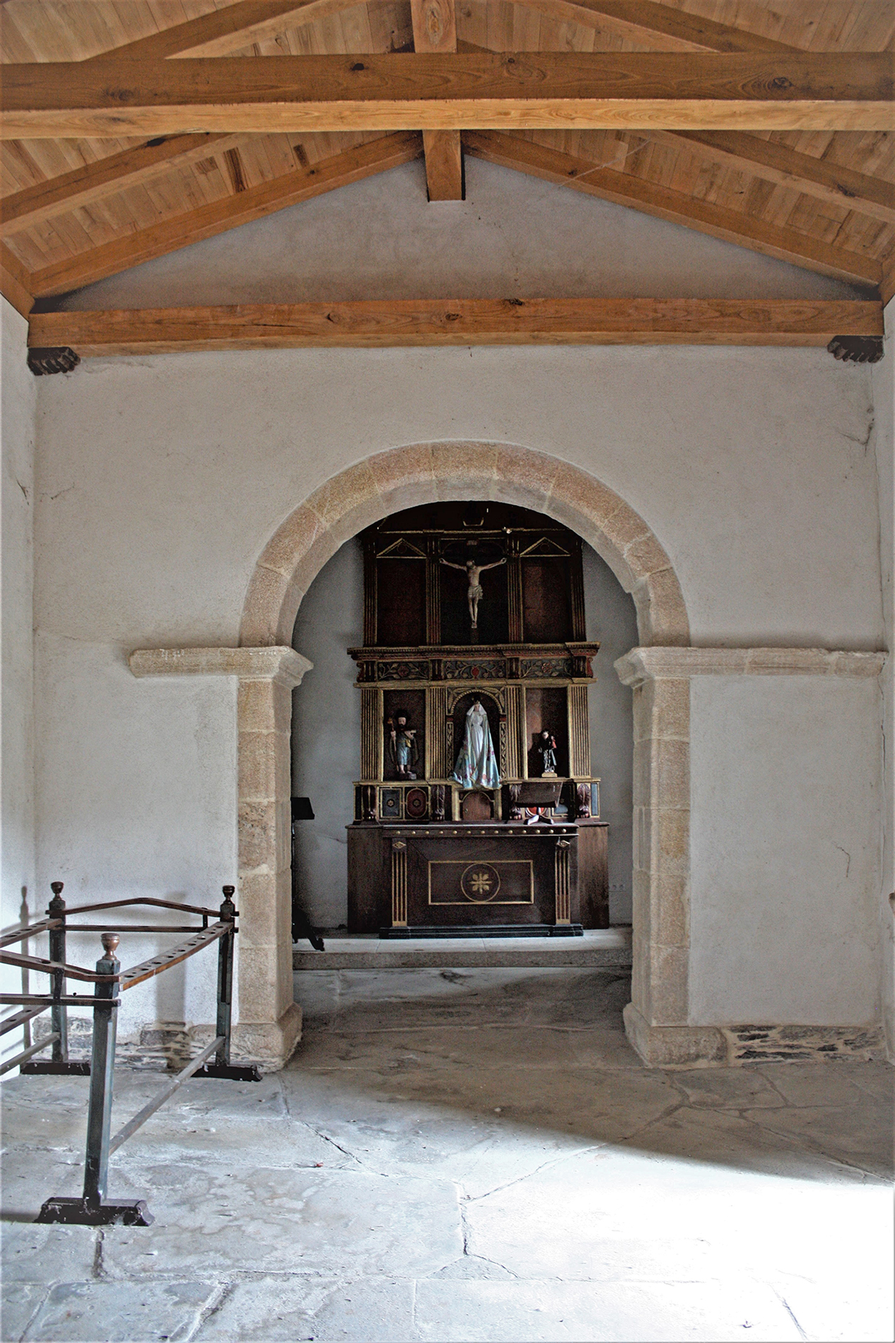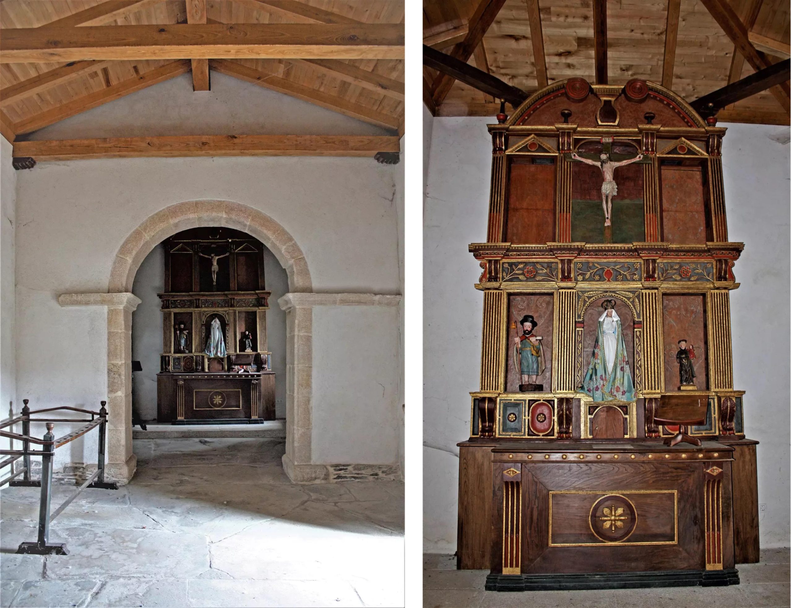 La austeridad exterior se transfiere al interior. La transición del presbiterio a la nave se hace mediante un arco de medio punto con jambas, rosca y línea de imposta de granito. En el interior del ábside se encuentra un retablo de madera del siglo XVII elevado sobre un alto banco y un sotabanco policromado cuenta con dos pisos con tres calles verticales. Remata en un frontón partido con decoración de volutas en los extremos internos. En las calles verticales se disponen las hornacinas que albergan parte del programa iconográfico con el que contaba la iglesia, de las que se conservan la Virgen, San Antonio y Santiago Peregrino y Cristo Crucificado.