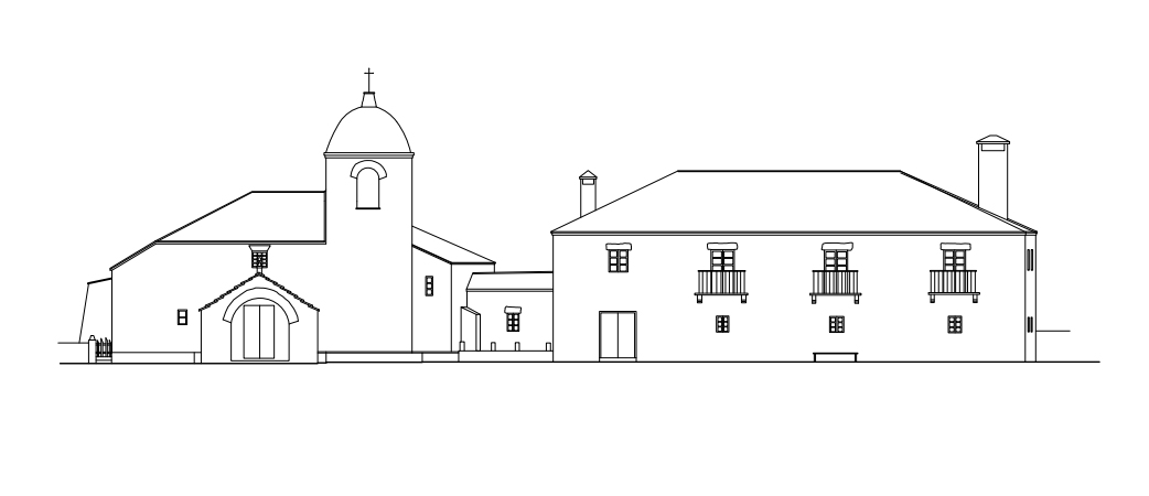 | Alzados de los frentes principales de la Iglesia de Santa María do Cebreiro y del Mesón de San Giraldo de Aurillac, situado a la derecha.