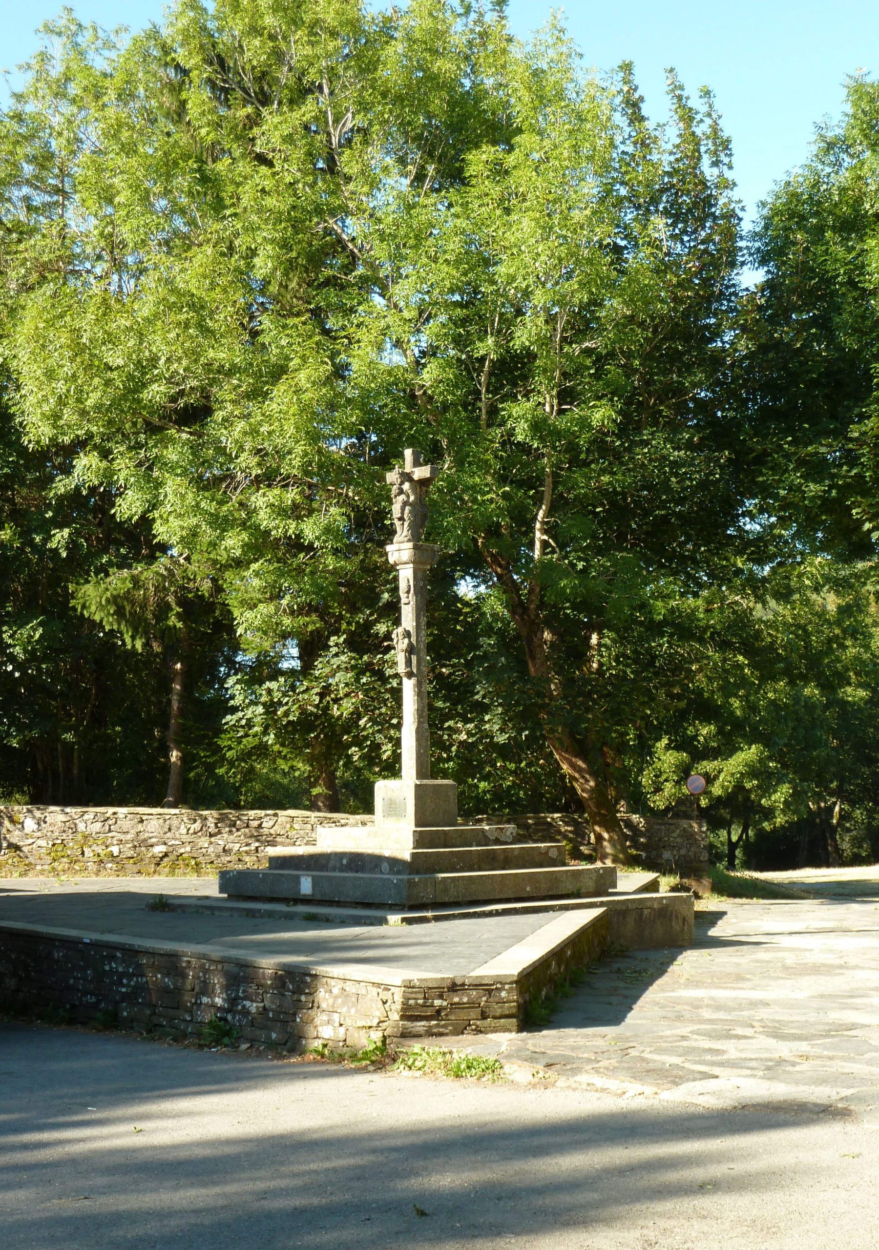 Tanto el crucero como el monolito se alzan ante el recinto murado de lo que fue el antiguo monasterio y priorato de Santa María que ejerció poderoso dominio sobre toda la zona. Hoy en día tan solo se mantiene en pie la iglesia monástica, reconvertida en parroquial con su nuevo cementerio y, junto a ella, la casa del mesón que los monjes benedictinos edificaron en el siglo XVIII; ambos edificios fueron restaurados entre los años 1962 y 1966. El antiguo hospital de peregrinos que hubo aquí fue demolido en el siglo XIX y nada queda de él; lo mismo ocurre con el resto de las dependencias del antiguo monasterio.