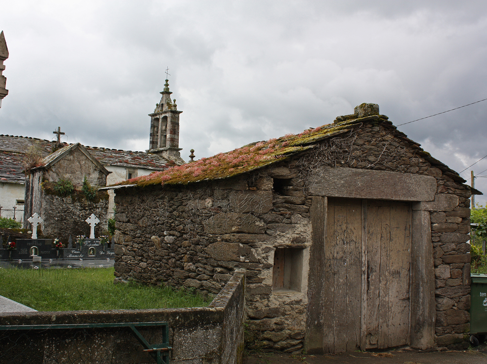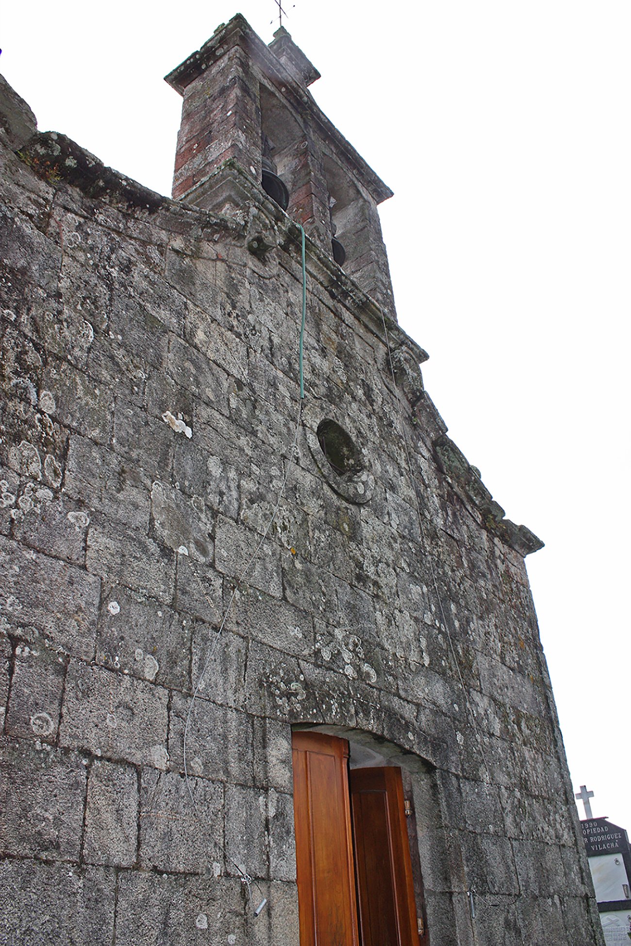 La iglesia se levanta en medio de un recinto murado, que también acoge en su interior el atrio y el cementerio parroquial. La entrada a este recinto tiene un pórtico con cubierta de pizarra a dos aguas y bancos adosados en los muros laterales, que sirvió de lugar de reunión a modo de cabildo.