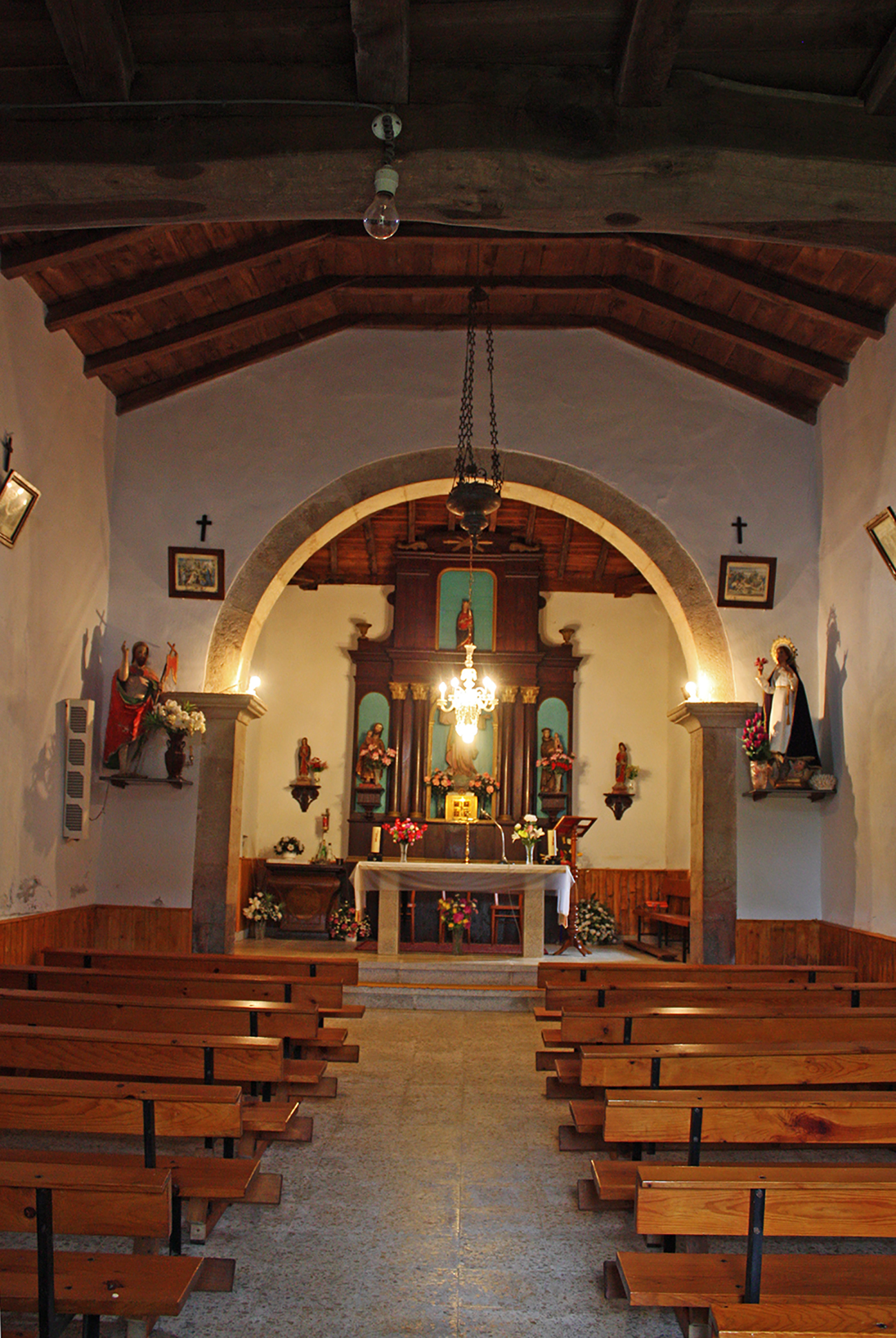 La iglesia consta de una sola nave, seguida por la cabecera que alberga el presbiterio y la sacristía, adosada en lado norte de la cabecera. La nave es de planta rectangular, a los pies cuenta con un coro alto de madera. La nave y el presbiterio se comunican por medio de un arco triunfal de medio punto, que arranca de dos impostas molduradas que sobresalen del muro. El cuerpo del presbiterio es de planta cuadrangular y tiene igual altura y anchura que la nave. Este recibe la luz del exterior a través de un ventanal rectangular con doble derrame que abren en el muro meridional; en el muro contrario una puerta adintelada comunica con la sacristía.