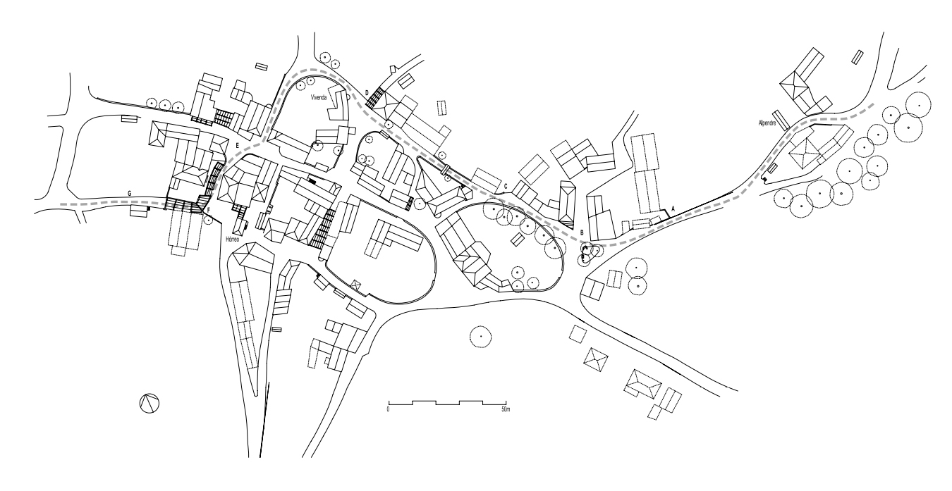 Plano del núcleo del lugar de Ferreiros. (José Antonio Franco Taboada, Santiago Tarrío Carrodeguas (dirs.), A arquitectura do Camiño de Santiago: descrición gráfica do Camiño Francés en Galicia, Santiago [de Compostela], Xunta de Galicia, A Coruña, Universidade da Coruña, D.L. 2000). |
