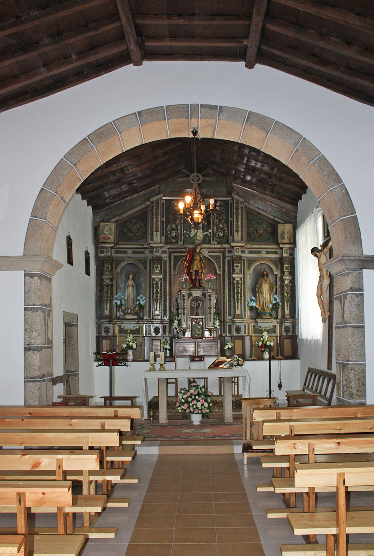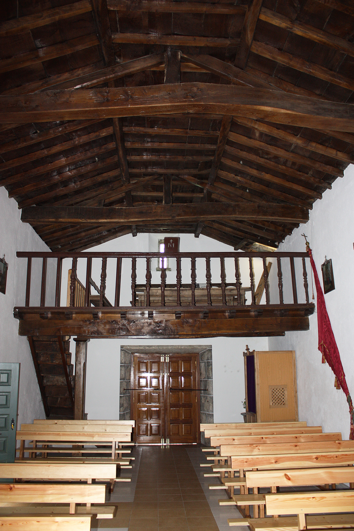 En el interior la nave se abre al presbiterio por medio de un arco triunfal de medio punto que se apoya sobre pilastras de sección rectangular con sencillas impostas. A los pies de la iglesia hay una tribuna alta de madera a la que se accede por una escalerita, también de madera situada hacia el lado sur. Bajo la tribuna, en la esquina noroeste de la nave, está la pila bautismal. La pila es una pieza monolítica de granito de grandes proporciones, tiene forma semiesférica y no presenta ningún tipo de ornamentación; se apoya sobre un pie cilíndrico también de granito.