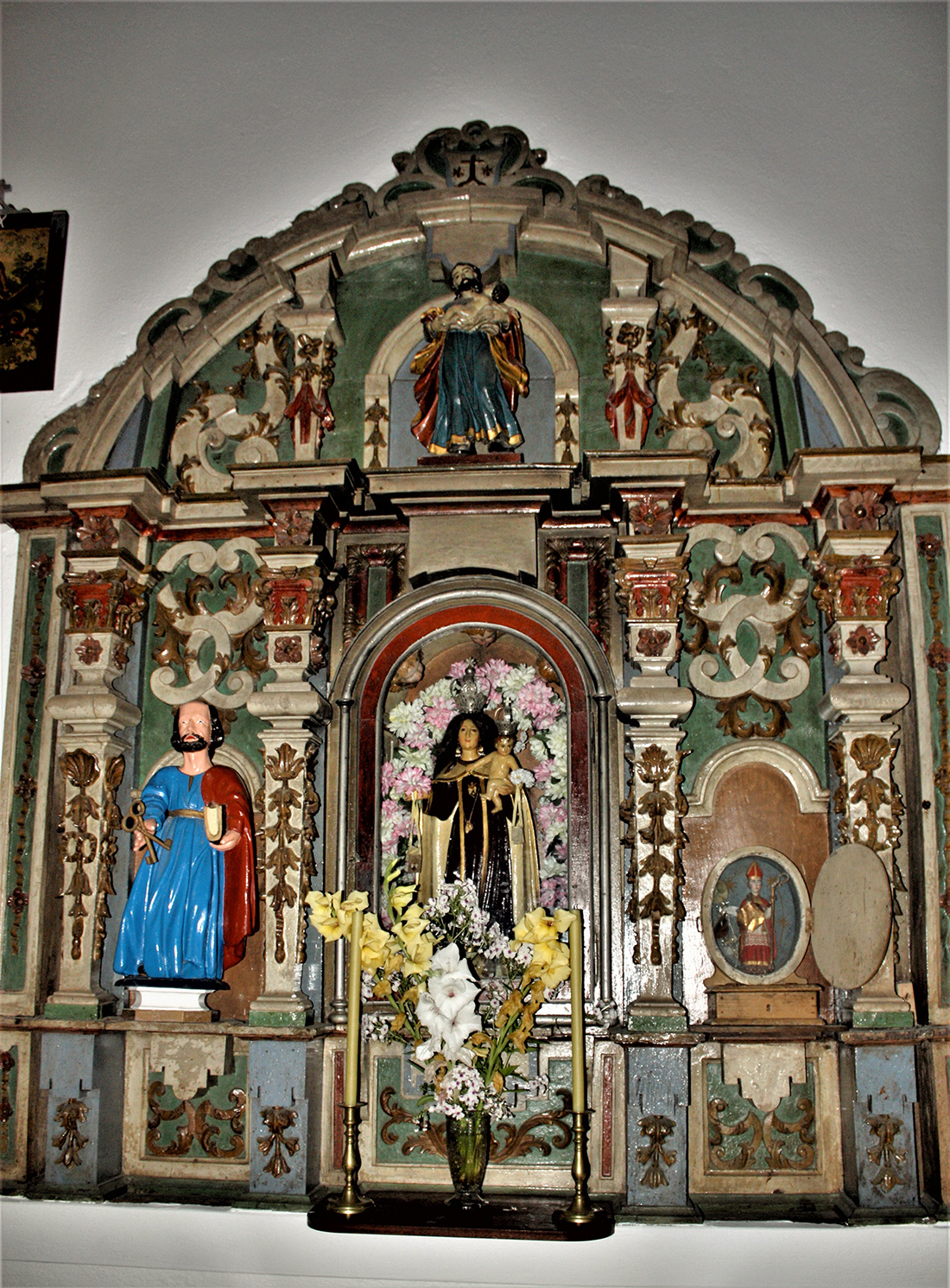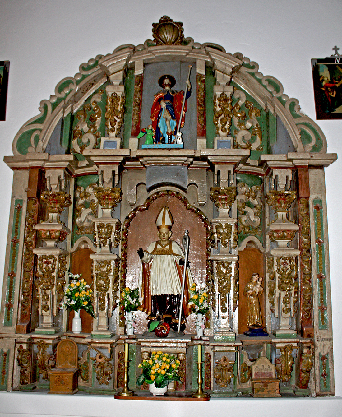 En la nave se encuentran otros dos retablos laterales que son gemelos. Constan de un cuerpo bajo divido en tres calles y un ático con frontón semicircular. Las imágenes que albergan estos dos retablos son posteriores a su fábrica y no se corresponden con ellos. El retablo del lado sur contiene en el primer cuerpo dos tallas representando a san Pedro (a la izquierda) y a la Virgen del Carmen (a la derecha) y también un curioso limosnero con la figura de un obispo. La única imagen del segundo cuerpo es la de san José con el Niño Jesús en brazos, colocada en la calle central. En el retablo norte, se pueden ver las imágenes de san Roque Peregrino (en la calle central del segundo cuerpo), san Antonio (a la derecha del primer cuerpo), y un santo obispo que pisa un diablo y pudiera ser san Nicolás (en el centro del primer cuerpo).