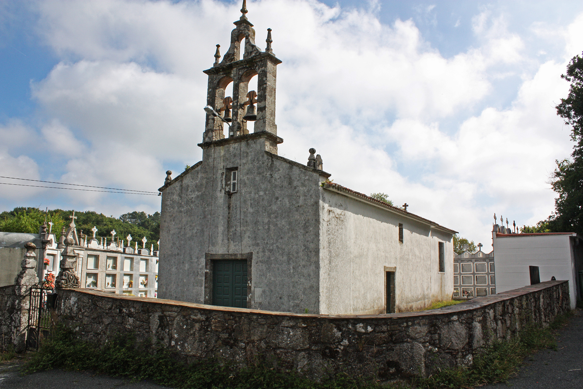 La espadaña de esta iglesia es de granito con dos arcos de medio punto en el cuerpo principal y un ático con frontón que tiene en el centro otro arquito más. Los arcos del cuerpo principal acogen las campanas y todo el conjunto está coronado por tres pináculos, el central rematado con una cruz de metal. Esta espadaña es igual a la de Santa María de Arzúa y muy parecida a las de las iglesias parroquiales de San Xoán de Furelos y de Santiago de Boente; la de Furelos es obra de comienzos del siglo XX.