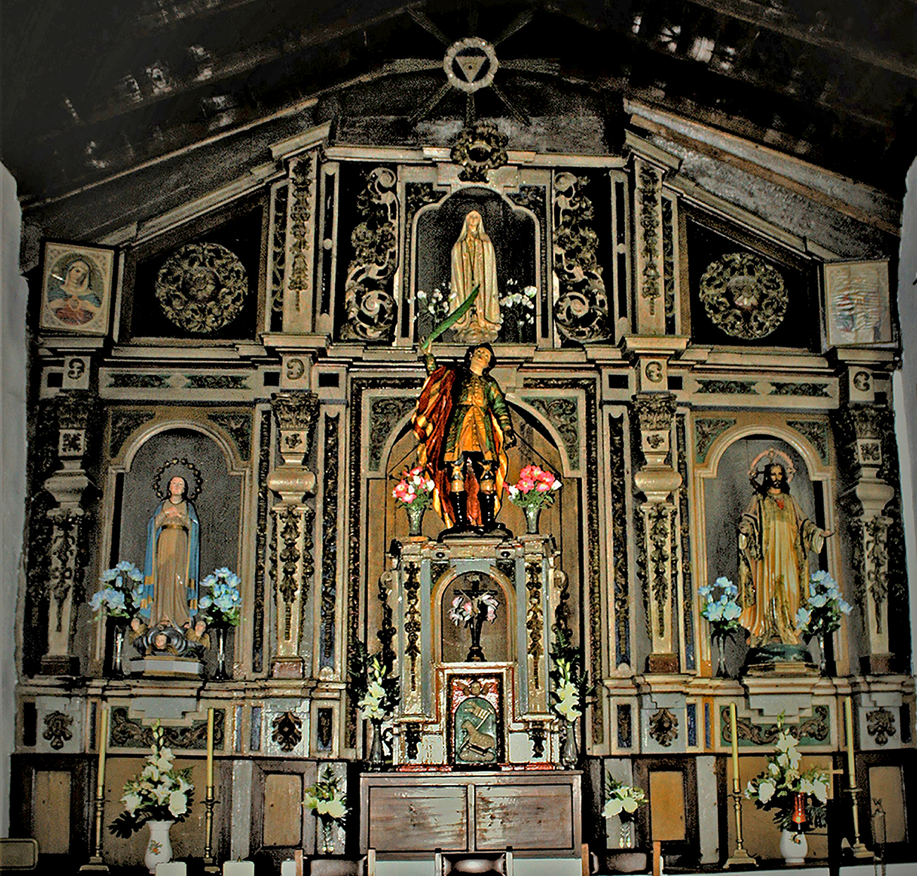 La iglesia está presidida por el retablo mayor de estilo barroco que se arrima al testereo del presbiterio; el retablo consta de un cuerpo principal que se divide en tres calles, separadas por estípites profusamente decorados con guirnaldas y rocallas realzadas con pan de oro. La calle central acoge el sagrario, con un pequeño cristo crucificado encima. Sobre el cuerpo del sagrario se colocó la imagen de san Paio, patrón de la iglesia; esta imagen es una talla policromada de bastante calidad que parece ser obra del siglo XVIII. La calle lateral del lado derecho acoge la imagen del Sagrado Corazón, mientras que la del lado izquierdo acoge la imagen de la Inmaculada Concepción; ambas son esculturas relativamente recientes, lo mismo que la imagen de la Virgen de Fátima que preside el ático. El ático tiene una calle central flanqueada por pilastras; a ambos lados se disponen dos medallones tallados en bajorrelieve con flores y rocallas. En los extremos se colocaron dos cuadritos que representan la Sagrada Familia (el de la derecha) y el busto de la Dolorosa (el de la izquierda). Sobre el retablo se alza un aura de nubes que irradia haces de luz; en el centro figura el triángulo que representa la Santísima Trinidad.