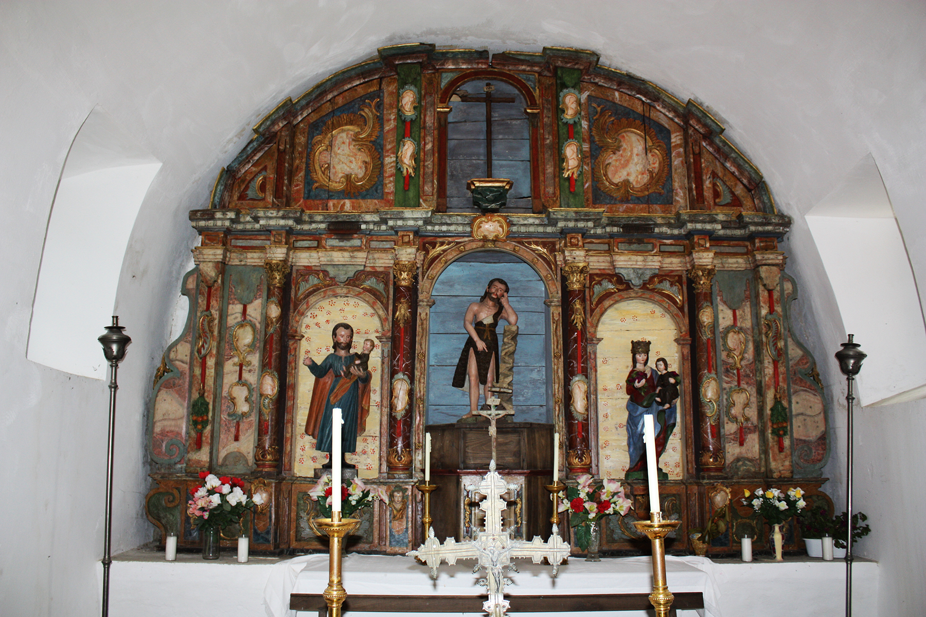 Se trata de un retablo de madera policromada, probablemente datado en el siglo XVIII, que se sostiene sobre un sotabanco corrido de fábrica. El trabajo de policromía del conjunto revela las intenciones de ennoblecer el material a través de la simulación de otros nobles, tales como el mármol y los dorados. Estos forman parte de los elementos capitales de la construcción, como los capiteles, los medallones incorporados en los fustes de las columnas y las molduras del entablamento y de los detalles de rocalla que se dejan ver en determinados espacios, ya que ninguno de ellos se libera de detalle ornamental.