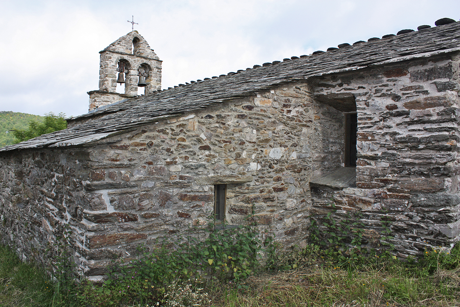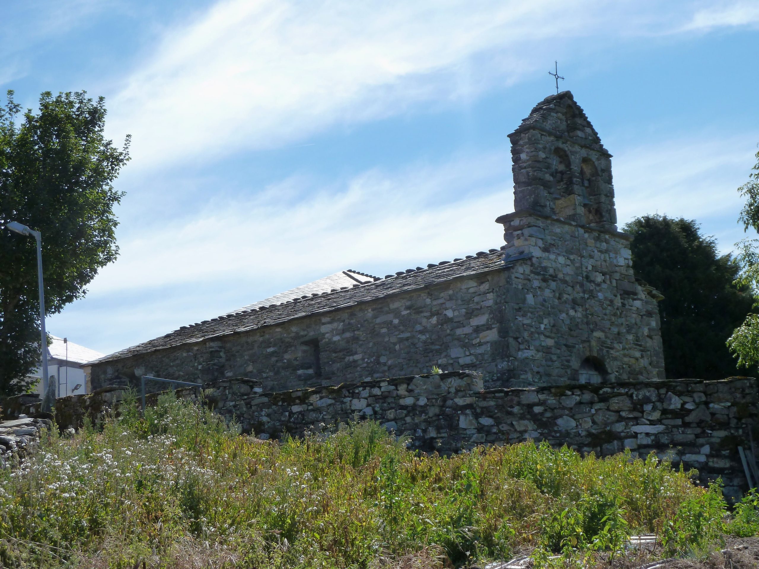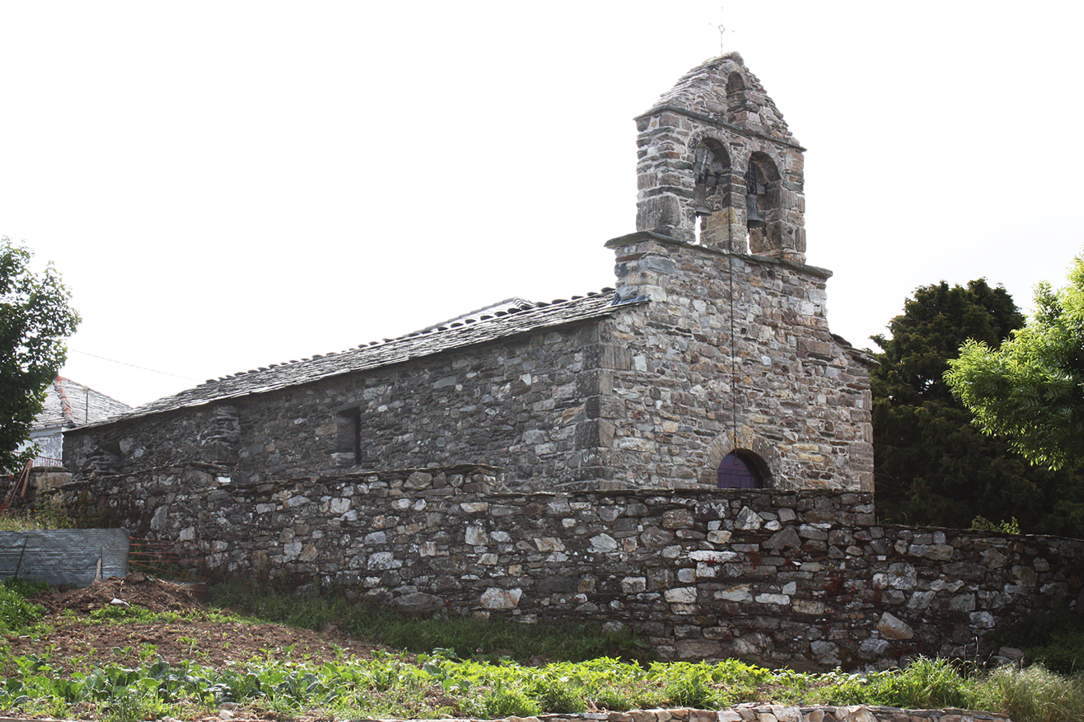 La mampostería ordinaria, gneises y esquistos con los que se construye la iglesia le confieren el aspecto sobrio que predomina el paisaje. Los muros laterales tan solo se alteran con los vanos de iluminación en la parte central de la nave en el muro sur y en ambos lados de la cabecera, además del vano de acceso secundario, ahora tapiado. El edificio se cierra con cubierta de pizarra a dos aguas.