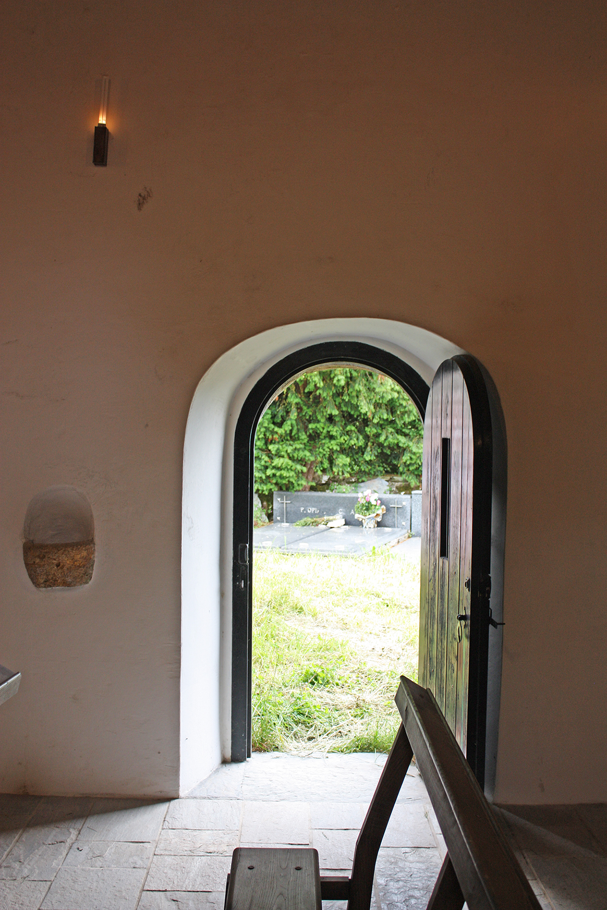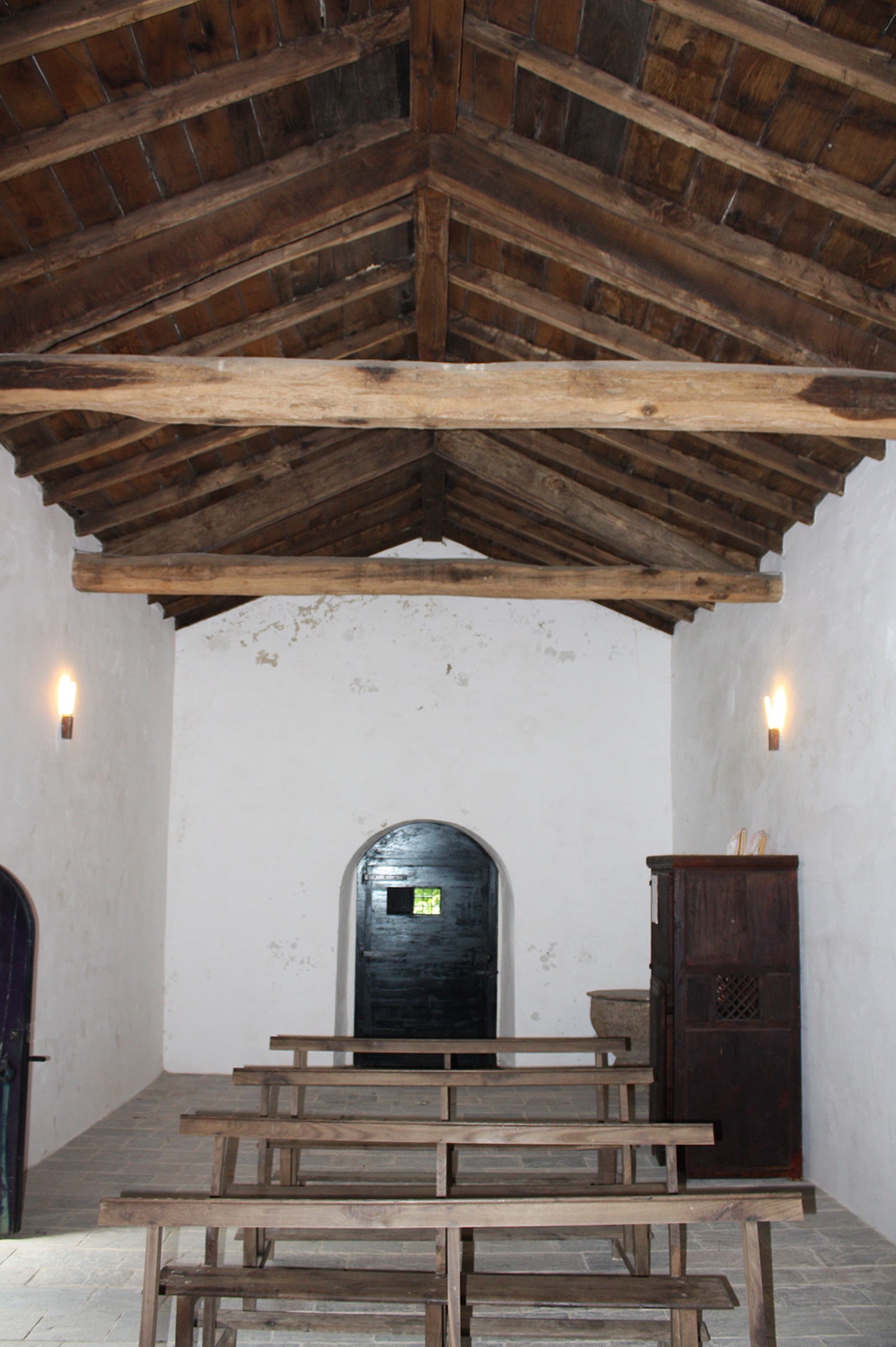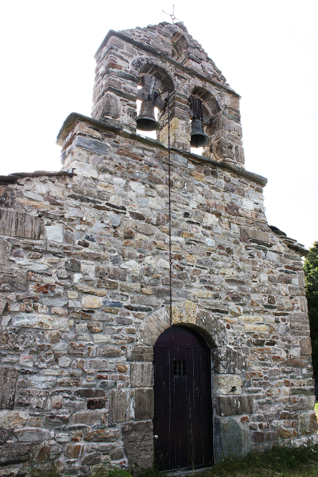 La mampostería ordinaria, gneises y esquistos con los que se construye la iglesia le confieren el aspecto sobrio que predomina el paisaje. Los muros laterales tan solo se alteran con los vanos de iluminación en la parte central de la nave en el muro sur y en ambos lados de la cabecera, además del vano de acceso secundario, ahora tapiado. El edificio se cierra con cubierta de pizarra a dos aguas.