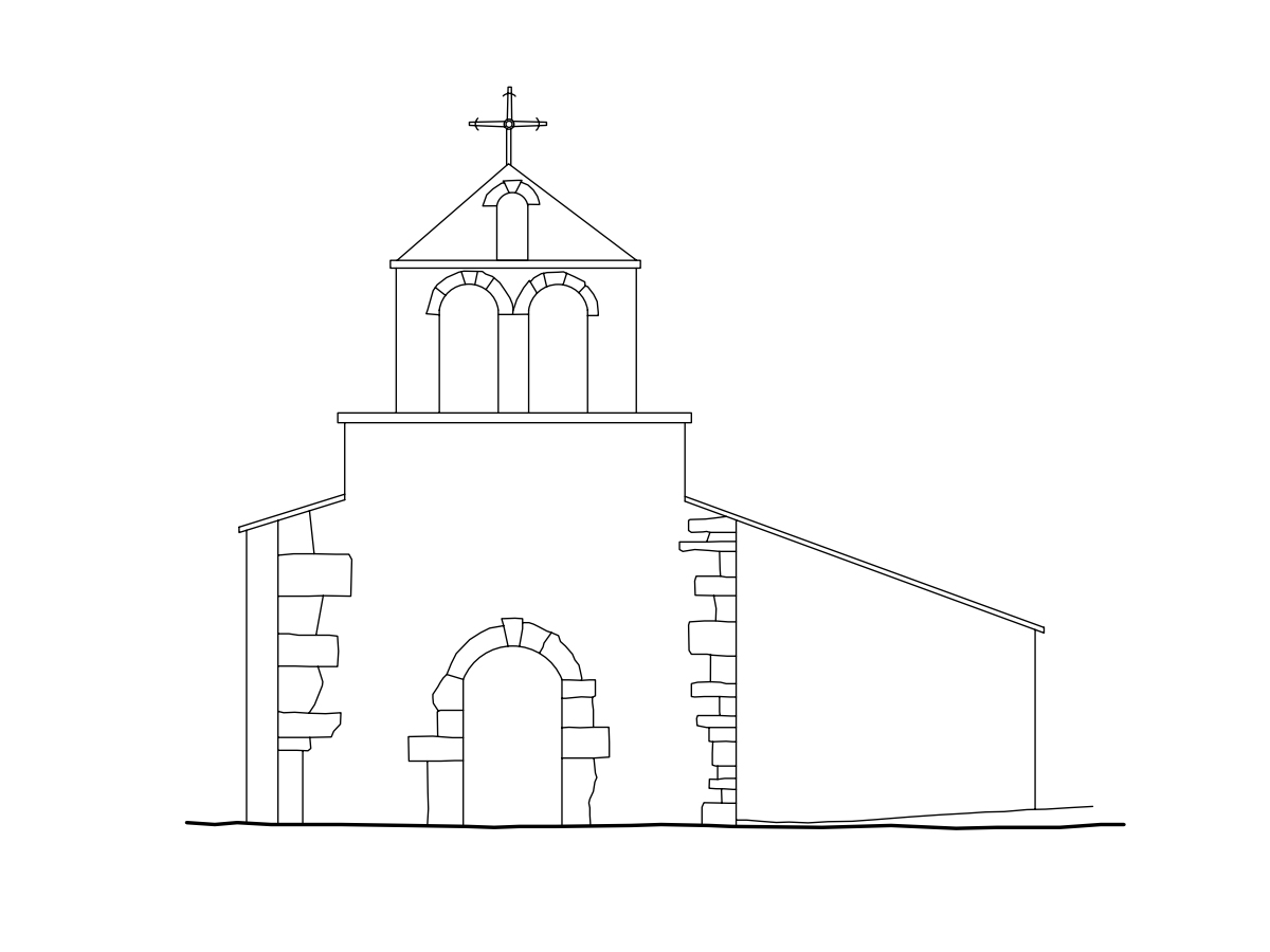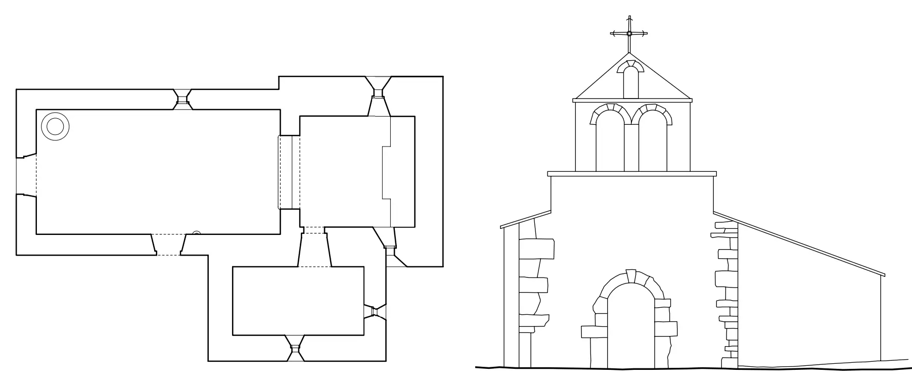 Planta de la iglesia (izquierda) y Alzado de la fachada principal (derecha). (José Antonio Franco Taboada, Santiago Tarrío Carrodeguas (dirs.), A arquitectura do Camiño de Santiago: descrición gráfica do Camiño Francés en Galicia, Santiago [de Compostela], Xunta de Galicia, A Coruña, Universidade da Coruña, D.L. 2000).