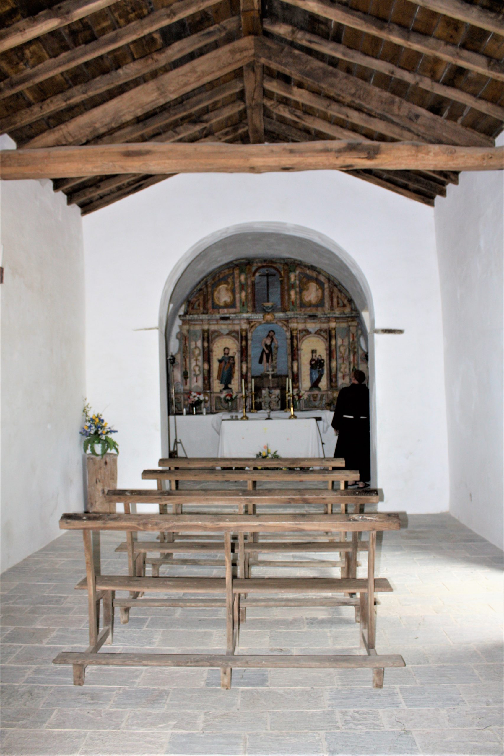 La planta de la nave es rectangular y a ella se suman tanto el ábside cuadrado de la cabecera (ligeramente más ancho que la nave) como el volumen rectangular anexo en el muro sur que hace el servicio de sacristía. En el interior, la nave sigue la forma a dos aguas de la cubierta, con estructura y cubrición de madera con vigas tirantes vistas. Tanto la sacristía como el presbiterio lo hacen con bóveda de cañón, determinada por el arco de medio punto que antecede a cada espacio y que permite generar este espacio abovedado. Es uno de estos arcos, en formato triunfal, el que permite el acceso de la nave al ábside, donde está ubicado el retablo del altar mayor.