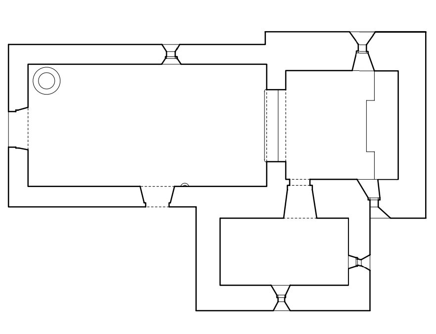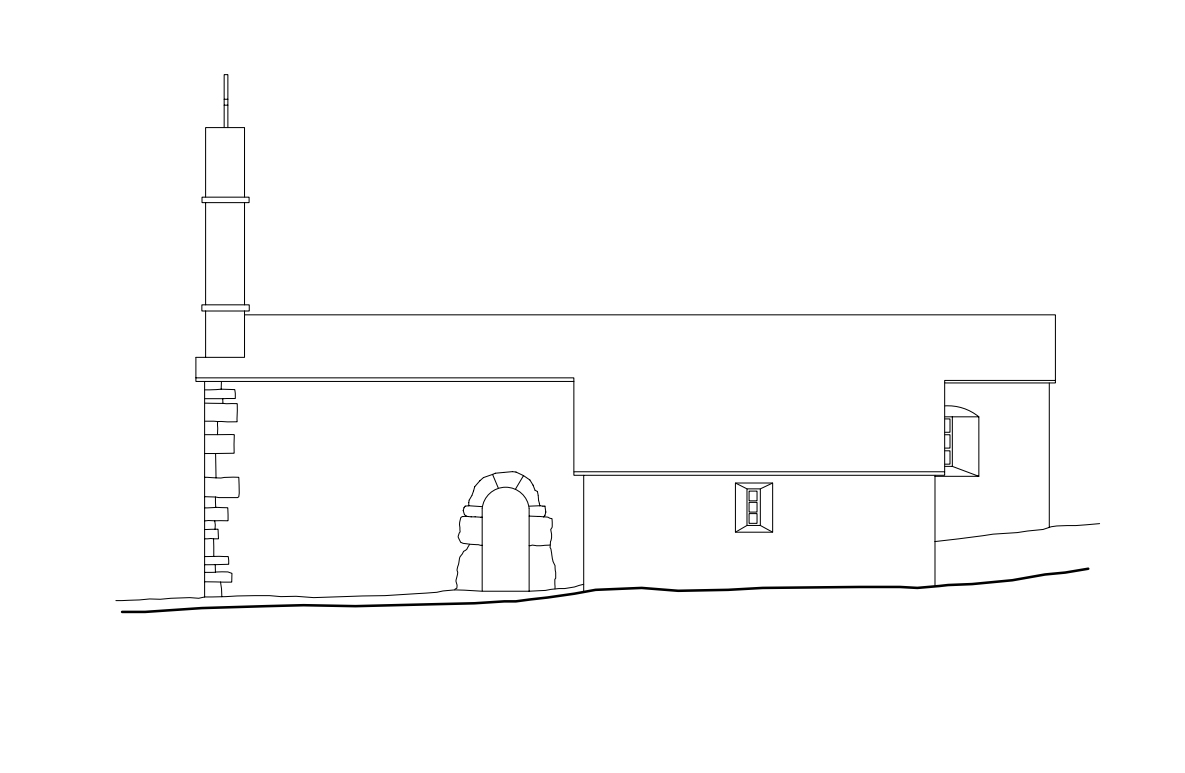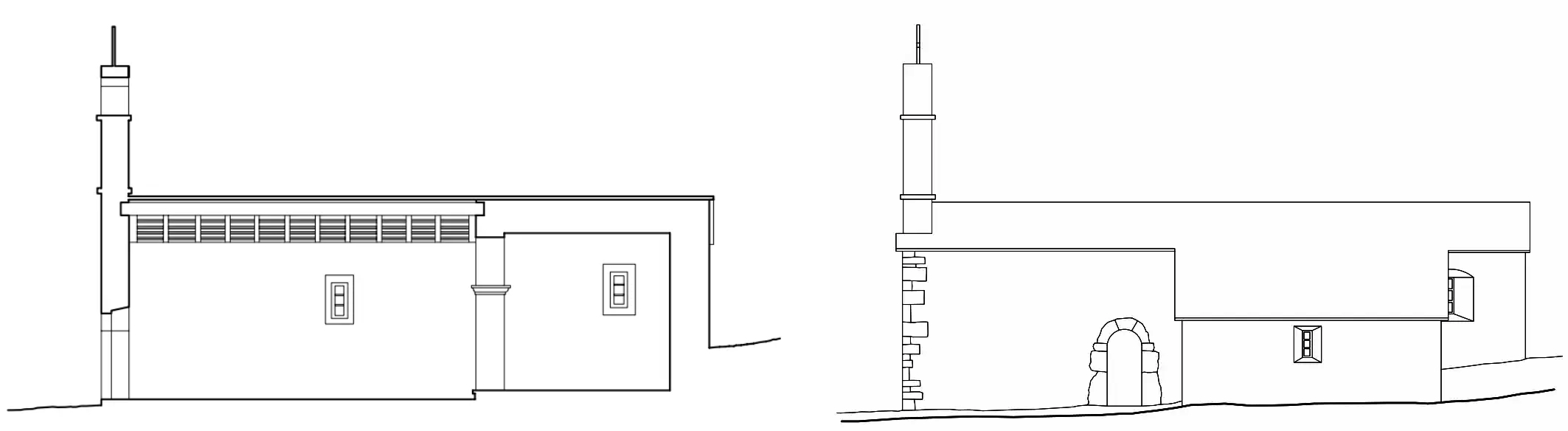 Sección longitudinal (izquierda) y alzado del muro sur de la ilgesia de San Xoánde Fonfría. (José Antonio Franco Taboada, Santiago Tarrío Carrodeguas (dirs.), A arquitectura do Camiño de Santiago: descrición gráfica do Camiño Francés en Galicia, Santiago [de Compostela], Xunta de Galicia, A Coruña, Universidade da Coruña, D.L. 2000).