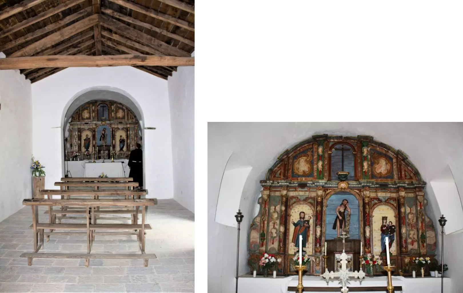 Interior de la nave (izquierda) y detalle del retablo del altar mayor (derecha).