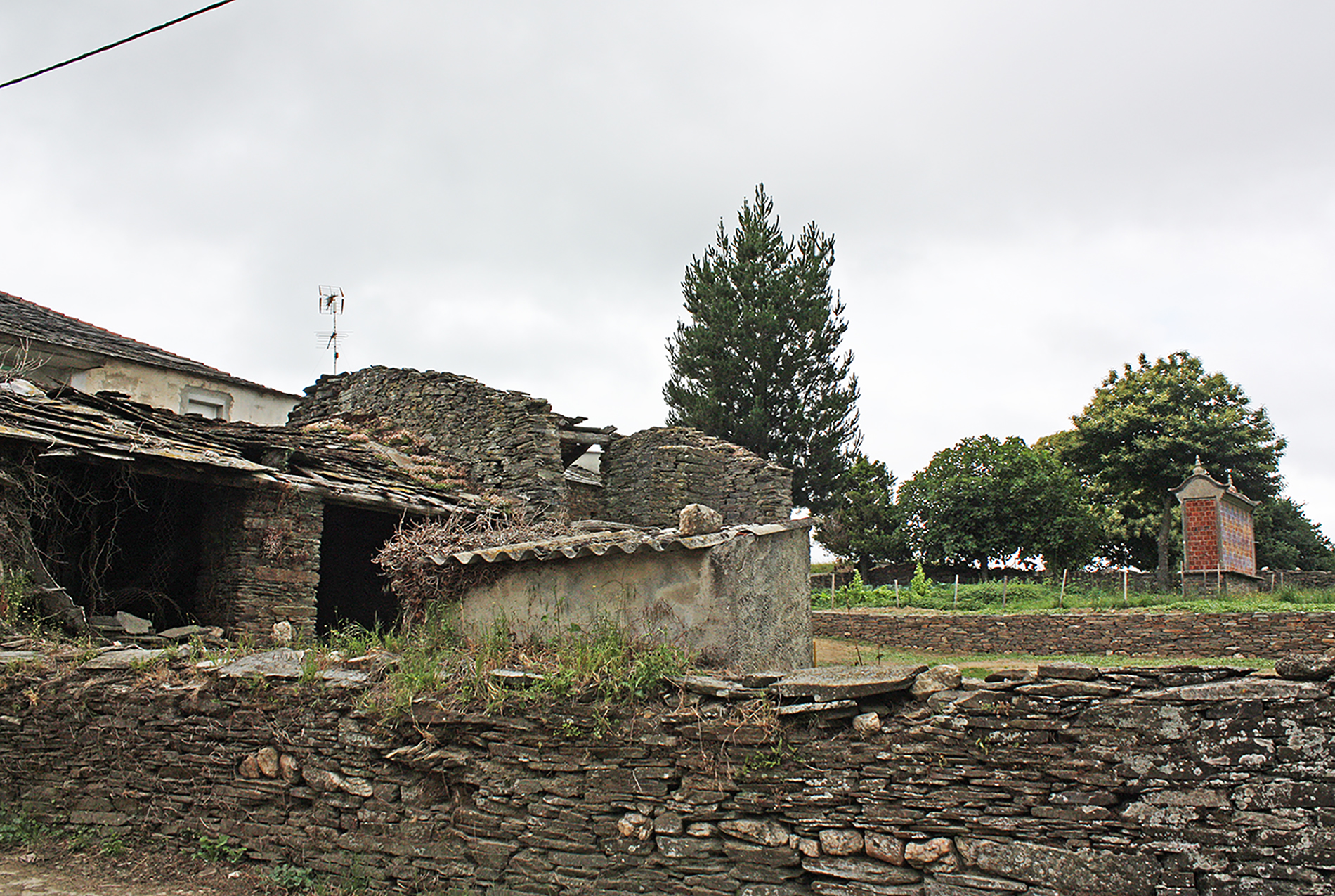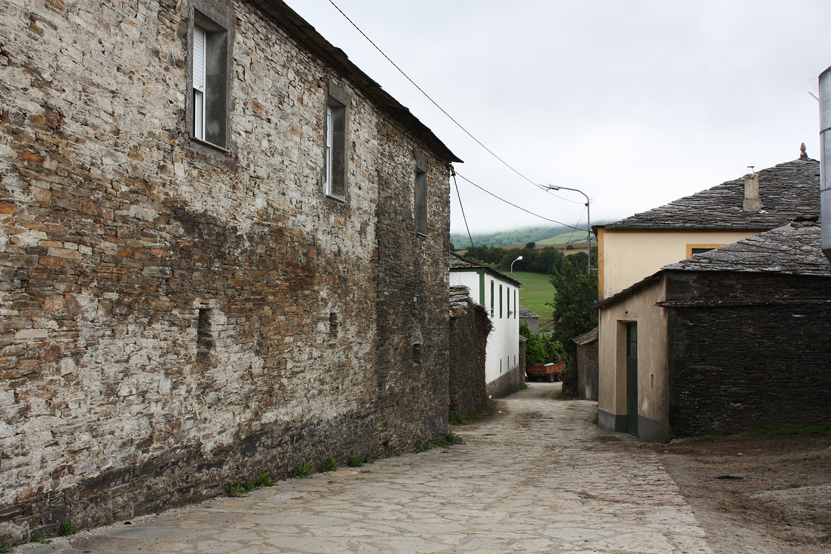 La población está íntegramente constituida por casas de labradores que se extienden a lo largo del Camino. Las casas fueron construidas al modo tradicional con muros de mampostería y cubiertas de pizarra; junto a ellas se levantan cobertizos, pajares y hórreos. Hay aquí una capilla dedicada a san Roque y junto a ella se alza un antiguo caserón muy reformado, en cuya fachada principal aparecen dos piedras heráldicas de mármol con distinta coloración y veteado, que se han reaprovechado para tapiar el vano de una ventana; una de ellas corresponde a una corona emplumada, la otra a un escudo cuartelado con la cruz de Calatrava, tal vez indicativa de la pertenencia a un caballero de dicha orden.