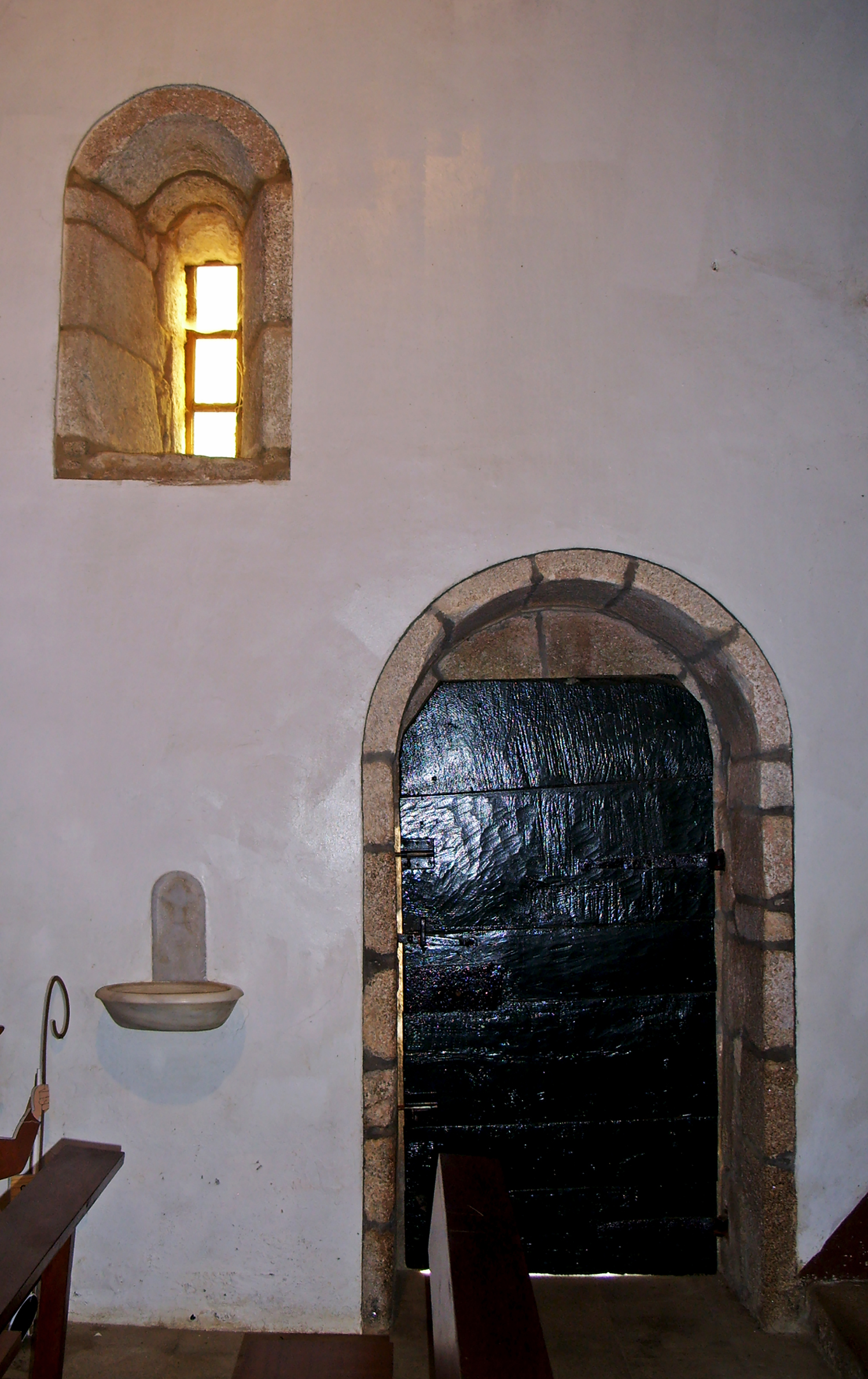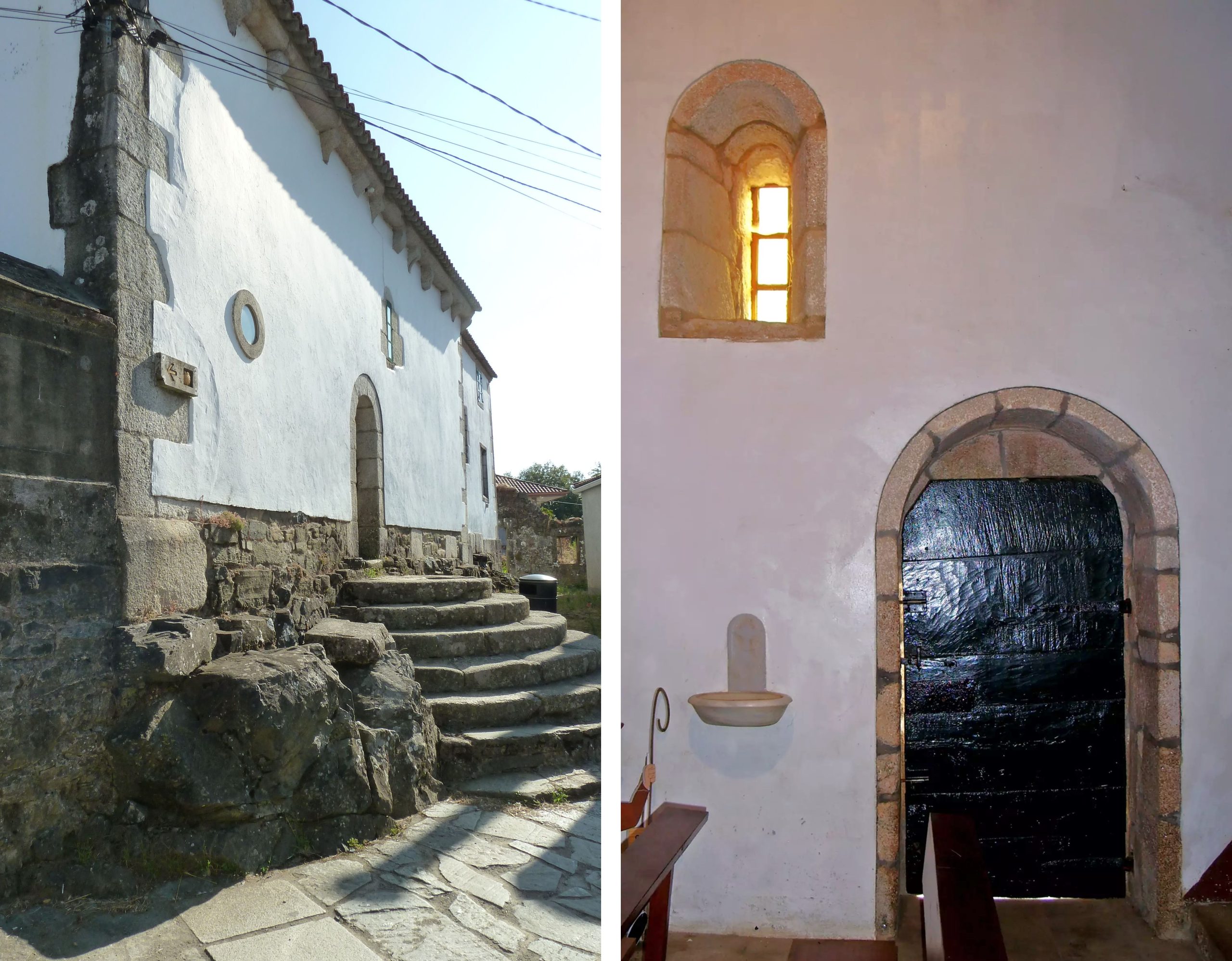 | Acceso secundario en el muro sur de la iglesia exterior (izquierda) e interior (derecha). |
