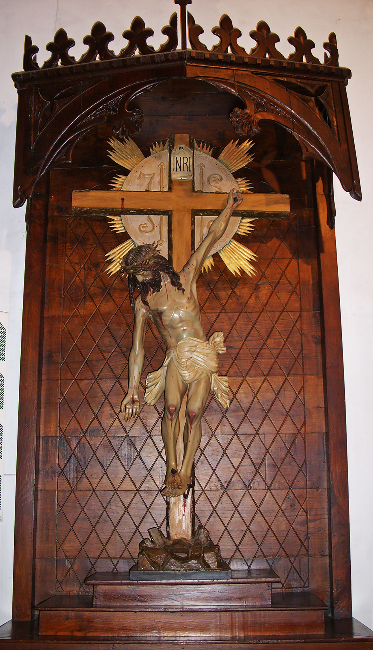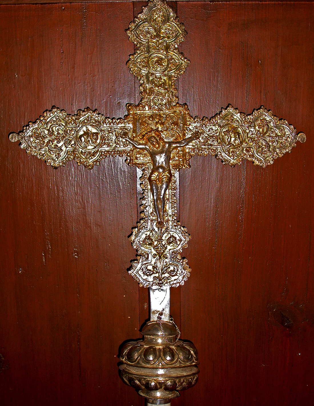 Entre los objetos que se guardan en el interior de la iglesia, destaca una cruz procesional de plata repujada.