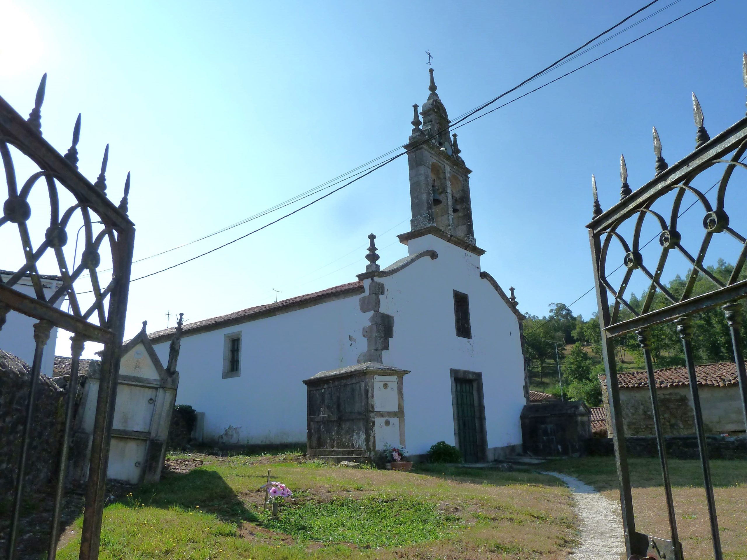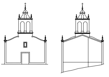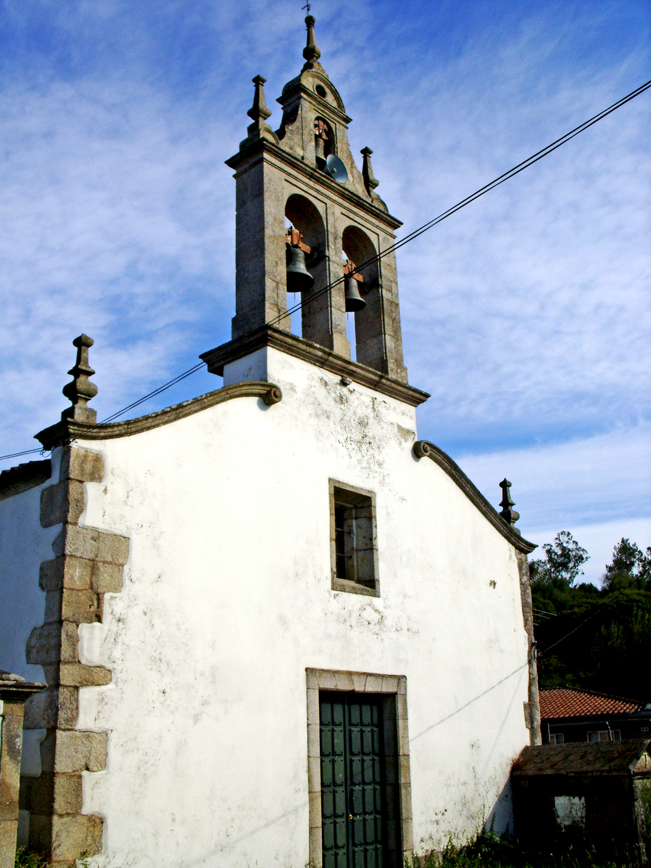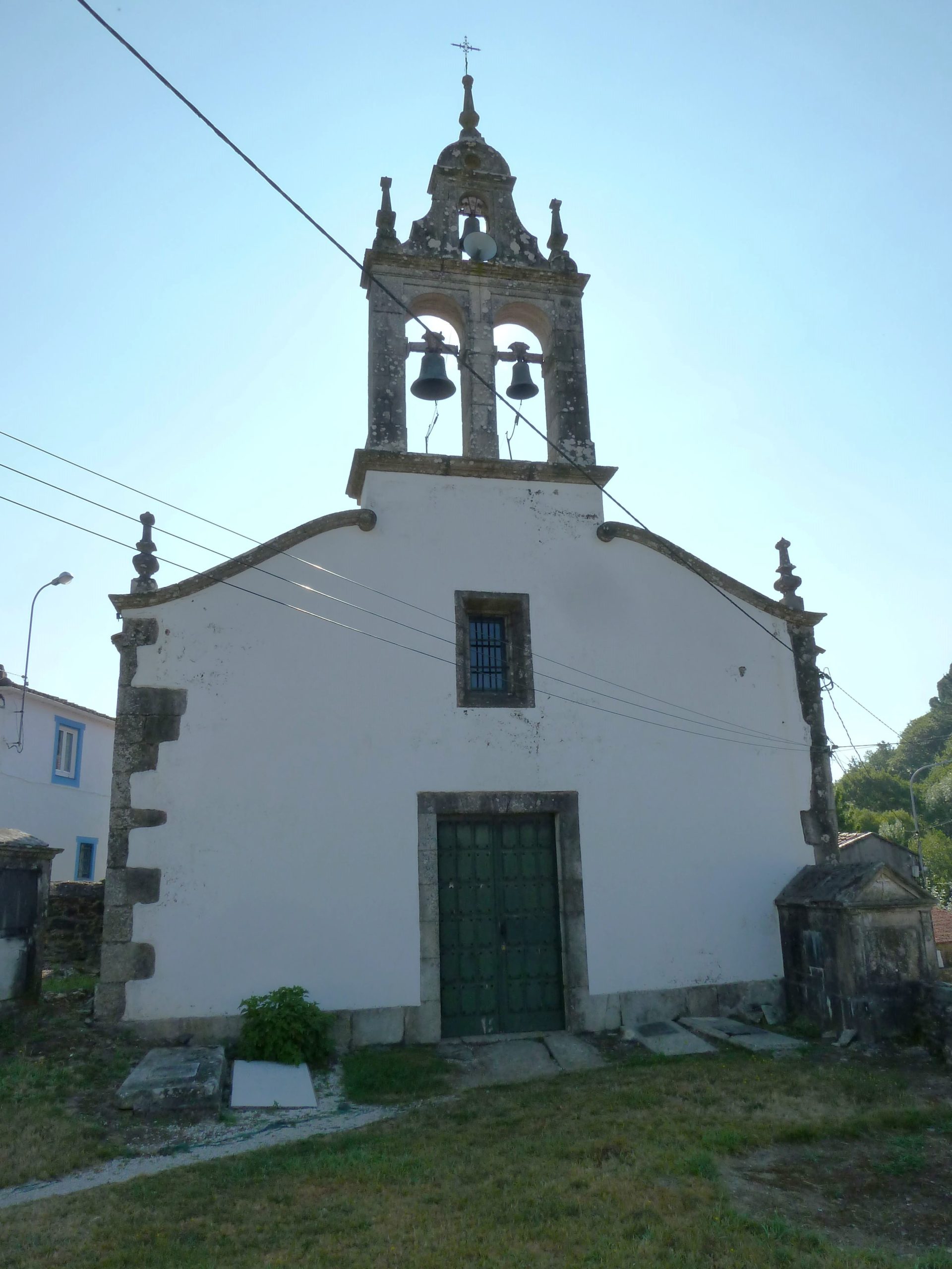 La fachada principal del edificio, la oeste, se presenta en un solo lienzo, con pináculos que marcan sus vértices superiores elevando el edificio y con cornisas molduradas de granito, ligeramente onduladas, que al estar interrumpidas rematan en volutas. El lienzo presenta un marcado eje central alrededor del que se ordenan los elementos. Se trata de un acceso adintelado seguido de un vano rectangular para la iluminación interior para rematar en una espadaña, elevada sobre la cubierta. Esta es de granito y presenta dos pisos: el primero, con dos cuerpos de vanos con arco de medio punto con sendas campanas; el segundo, un único vano de del que pende la tercera campana. Este segundo cuerpo está flanqueado por pináculos de piedra y rematado por un frontón semicircular horadado con un óculo y sobre el que yergue un tercer pináculo y una cruz metálica. La obra de la espadaña es de comienzos del siglo XX y fue realizada por Xosé Ponte, de Boente. Comparte características formales idénticas con la iglesia parroquial de Santiago de Boente (ayuntamiento de Arzúa, provincia de A Coruña), situada también sobre el Camino Francés.