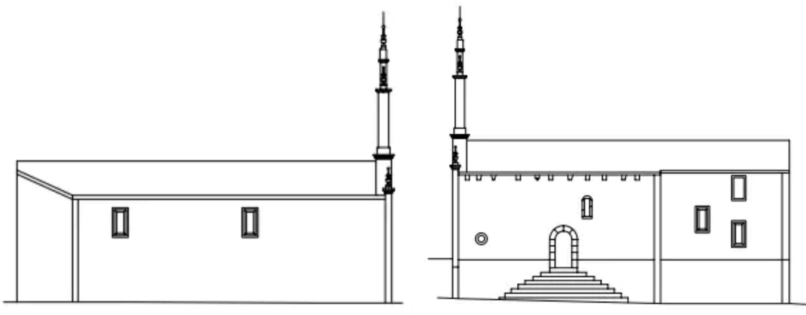 | Alzado de la fachada anterior, oeste (izquierda) y alzado de la fachada posterior, este (derecha). |