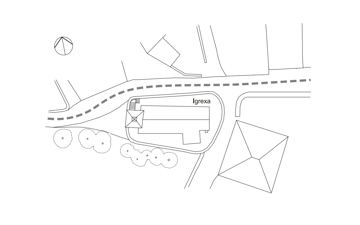 Trazado del Camino Francés ante la iglesia de San Xoán de Hospital. (José Antonio Franco Taboada, Santiago Tarrío Carrodeguas (dirs.), A arquitectura do Camiño de Santiago: descrición gráfica do Camiño Francés en Galicia, Santiago [de Compostela], Xunta de Galicia, A Coruña, Universidade da Coruña, D.L. 2000).