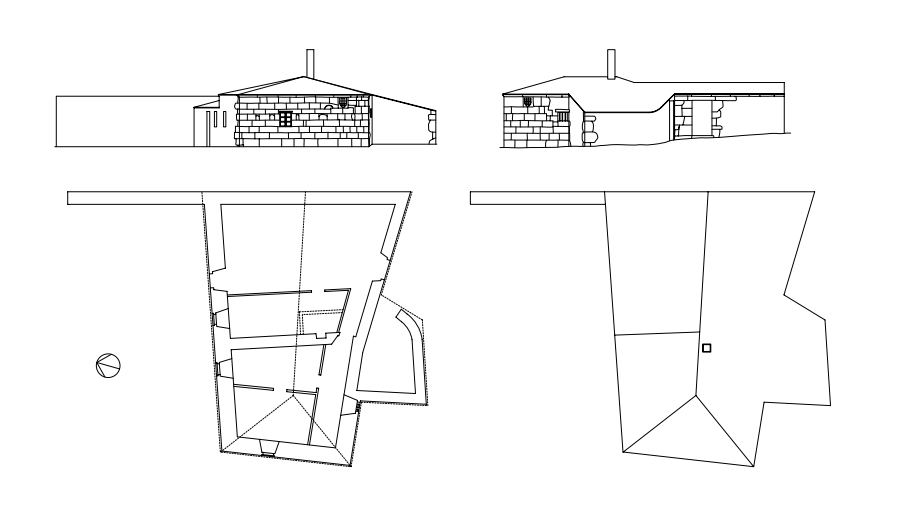 Alzados de las fachadas lateral y principal de la Casa del Hospital; planta y cubierta.