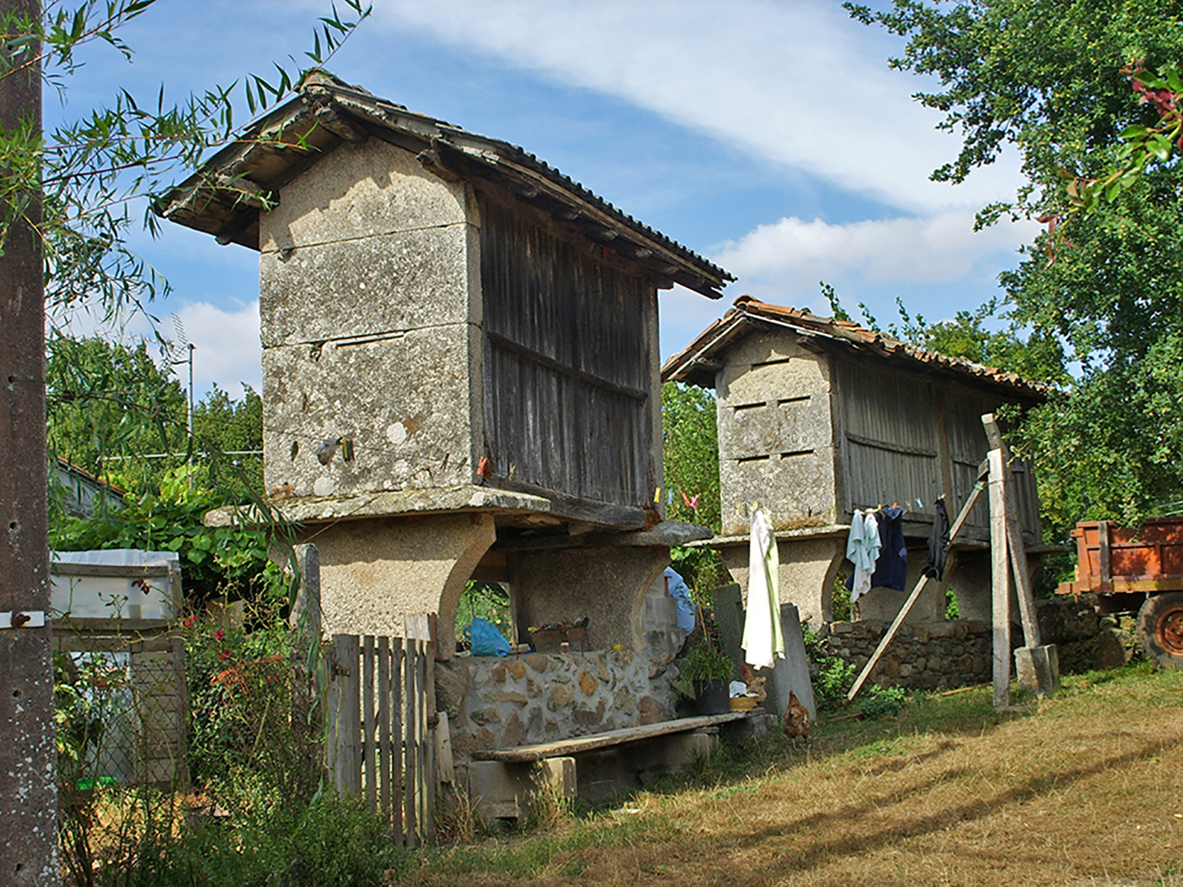 Los hórreos aquí son de armazón pétreo con paredes de tablazón y piedra que dejan correr el aire y se apoyan, bien sobre varios pedestales que son corridos todo a lo ancho de la estructura, bien directamente sobre los plintos en el que se elevan. También pueden verse aquí las “pallotas” típicas de la zona; están destinadas a guardar el grano y tienen paredes y techumbre de entramado vegetal.
