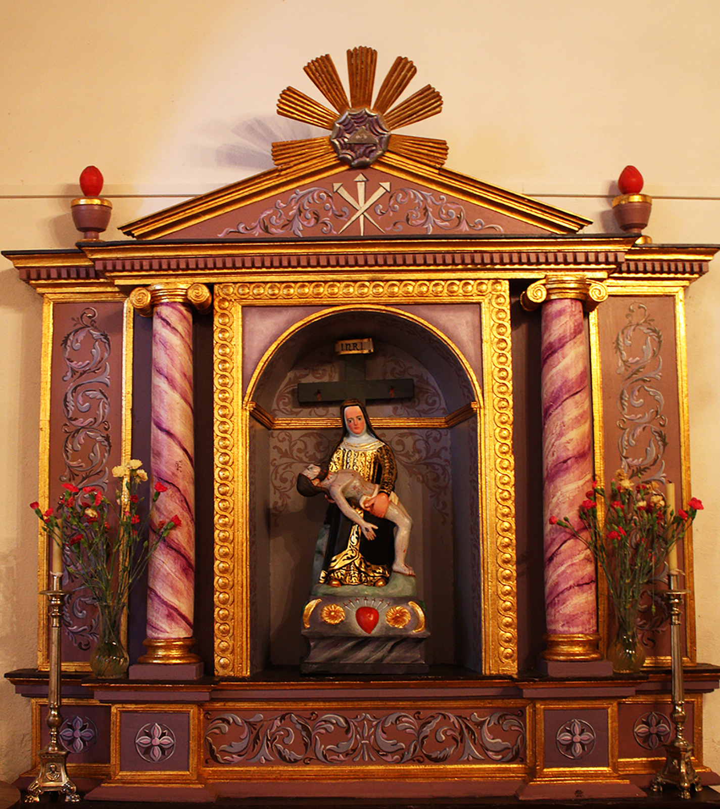 Este programa iconográfico se completa con los retablos ubicados en la nave de la iglesia. En el muro del Evangelio está ubicado el retablo dedicado a la escena de la Piedad. Se trata de un retablo neoclásico que en planta describe una forma de «U», de tal modo que aprovechan el saliente de esta forma para ubicar en él la mayor carga decorativa e iconográfica del conjunto. Dos columnas de orden jónico con fuste circular y policromía que simula el mármol flanquean un espacio abovedado (enmarcado a su vez por una moldura dorada con un patrón circular al que envuelven líneas ondulantes) en el que se sitúa el grupo escultórico de la Piedad. Los laterales, el banco y el frontón se decoran con policromía de motivo floral. Este último elemento, el frontón, se acompaña de sendos pináculos, también policromados.