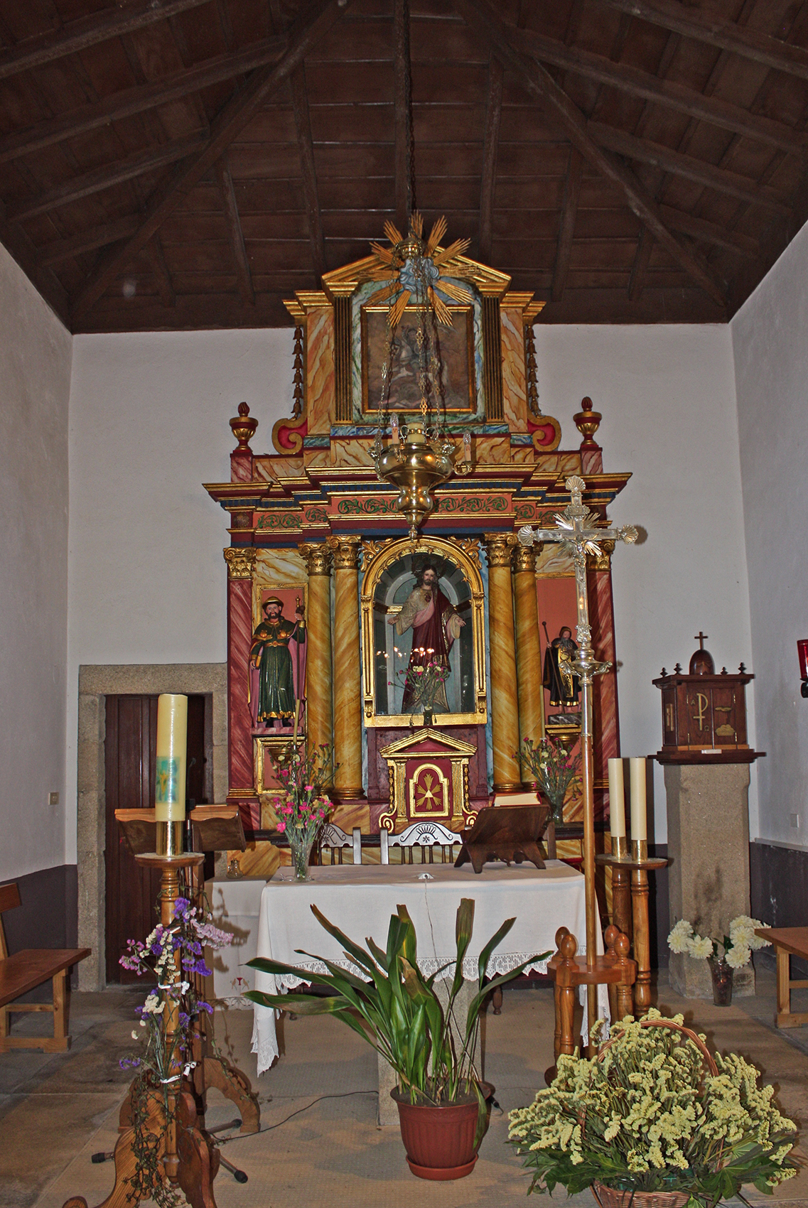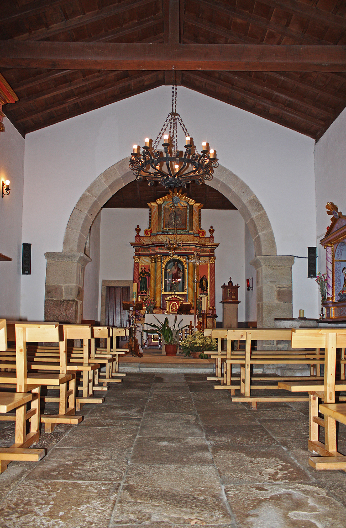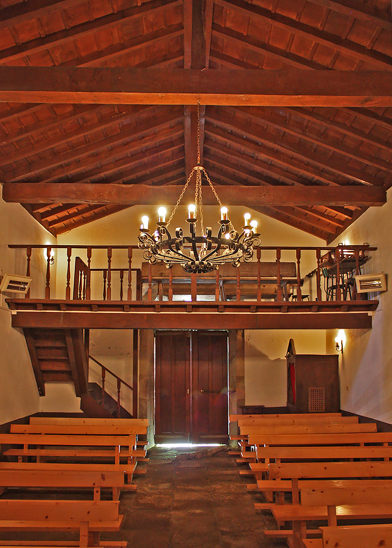 En el interior, a los pies de la iglesia, cuenta con un coro alto, al que se accede mediante las escaleras de madera dispuestas, el mismo material empleado para el forjado y la barandilla con acceso a la nave. La nave, de un tramo, está separada del ábside por un gran arco triunfal de medio punto en el que se mantiene en piedra vista tanto la rosca y el intradós del arco como las impostas molduradas en las que descarga en los pilares adosados al muro. Los paramentos interiores, pintados de blanco, son interrumpidos por vanos abocinados para la iluminación de la nave, dispuestos en la parte superior del muro, cercana a la cubierta. La nave se cubre con un entramado de madera sostenido por vigas del mismo material.