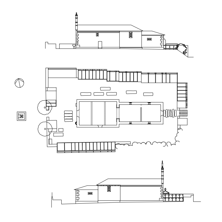 Alzados, planta del recinto y de la iglesia de Santiago de Lestedo. (José Antonio Franco Taboada, Santiago Tarrío Carrodeguas (dirs.), A arquitectura do Camiño de Santiago: descrición gráfica do Camiño Francés en Galicia, Santiago [de Compostela], Xunta de Galicia, A Coruña, Universidade da Coruña, D.L. 2000). |