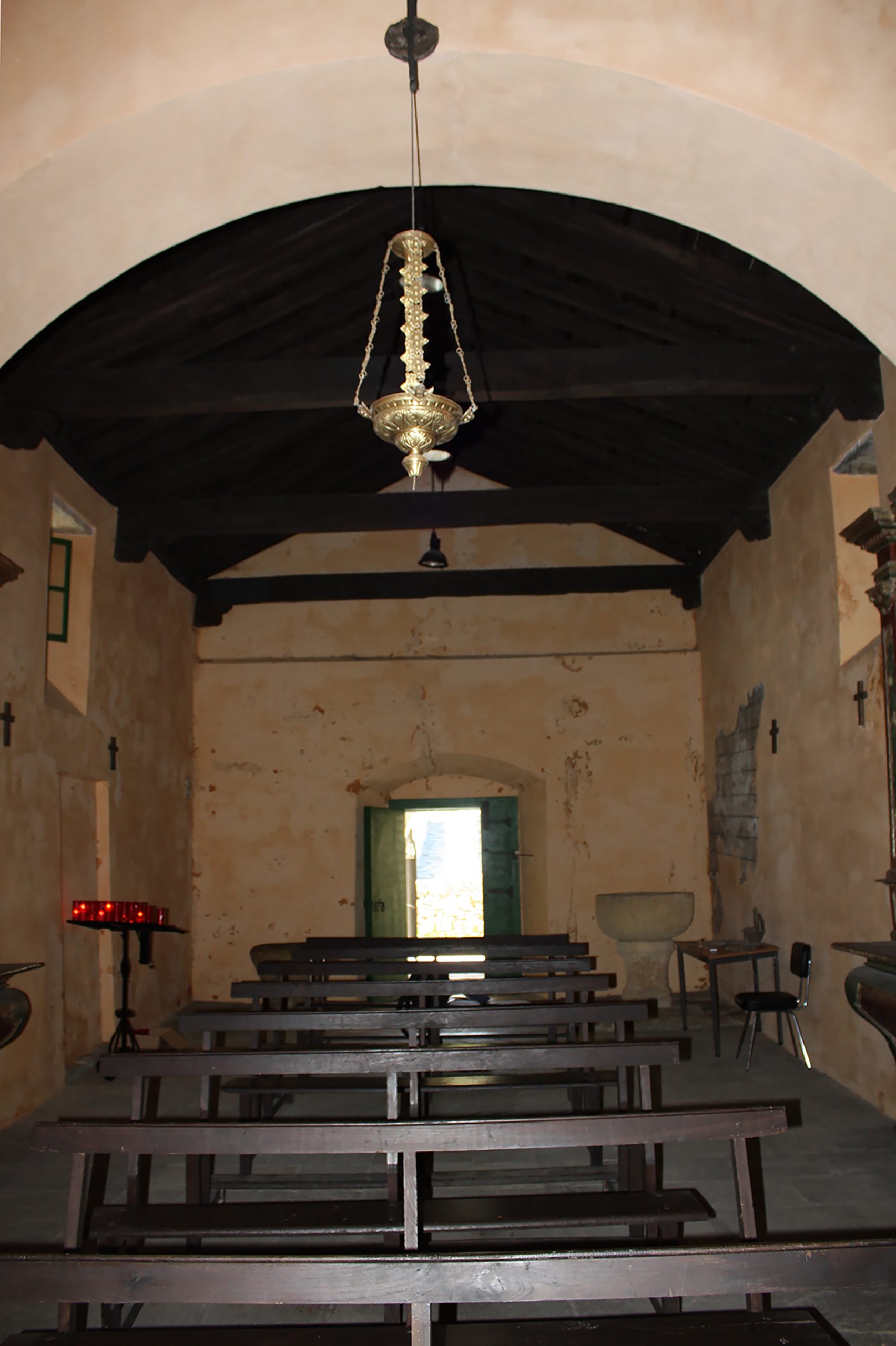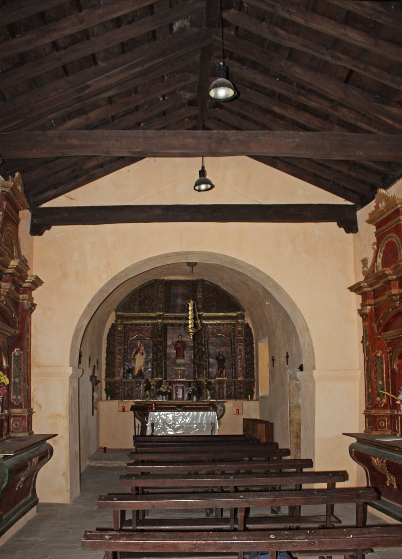 El interior del templo está descrito por una nave de planta rectangular divida en dos tramos: la nave principal y la cabecera, a la que se adosa el cuerpo de la sacristía. La transición entre las dos primeras se lleva a cabo por un arco de medio punto de tipo triunfal, de amplia luz y sencillas formas liberadas de cualquier ornamento que sume a la arquitectura. Este arco está enlucido y arranca de dos líneas de imposta en las que continúan los pilares adosados al muro que lo sostienen y que son imperceptibles debido al acabado enlucido del paramento. El espacio que acoge al presbiterio y a la capilla mayor —la cabecera— está cubierta por bóveda de cañón, mientras que la nave presenta cubrición de madera siguiendo las aguas de la cubierta con una estructura interior de tirantes del mismo material para su sujeción. A los pies de la iglesia se encuentran dos pilas bautismales, talladas en bloques monolíticos de granito.